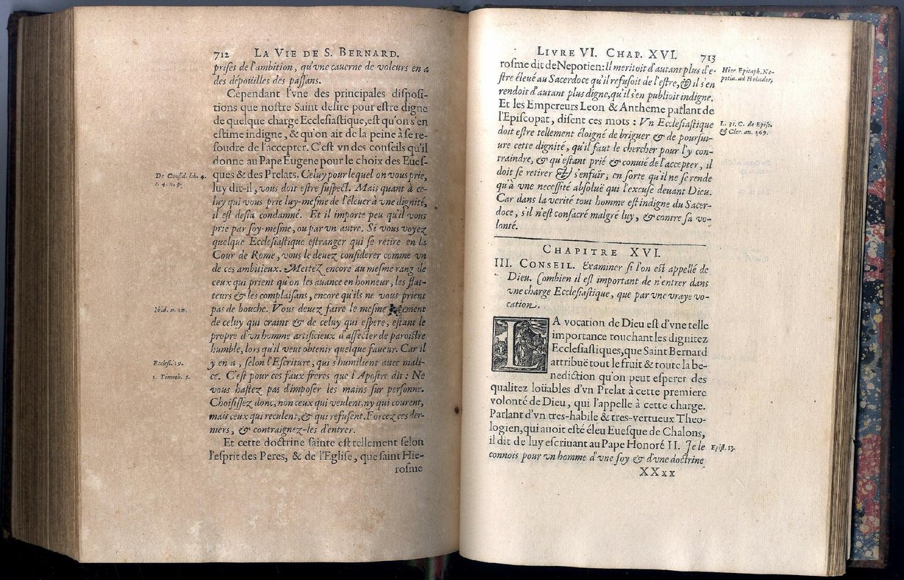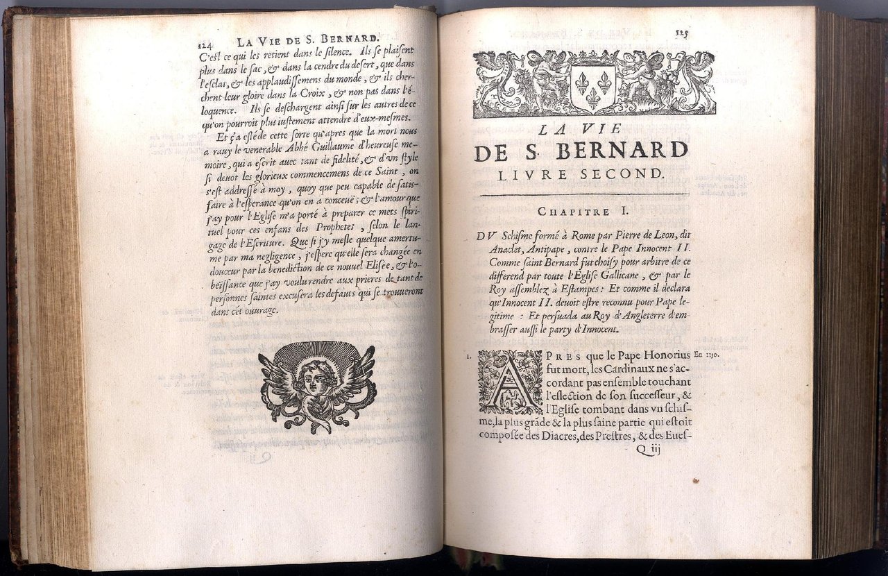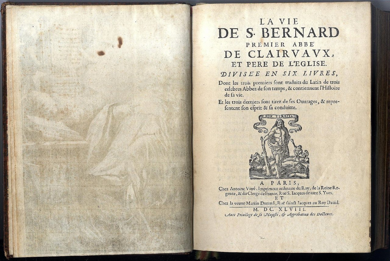 >in-4, pp. (32) tavola in antiporta, frontespizio e lettera al lettore, 764, (12) di indici dei capitoli. Legatura ottocentesca in p. vitello, titolo in oro su tassello al dorso, bei fregi floreali al dorso, filetti ai piatti e dentelles, sempre in oro, tagli spruzzati, testatine e capilettera ornati. Prima edizione di opera più volte ristampata e scritta da Le Maistre sotto pseudonimo di Lamy (citato ne l'Approbation), che tradusse dal latino i primi tre libri sulla vita di S. Bernardo e compose i secondi tre basandosi sulle sue opere. La tavola in antiporta è un ritratto del santo tratto da un dipinto di Philippe de Champaigne (1602-1674) andato perduto, ma presente fino al 1711 presso l'abbazia di Port-Royal-des-Champs. Buon esemplare assolutamente fresco e a pieni margini (salvo tavola in antiporta rifilata al margine inferiore, uniforme e lieve bruniura dei fogli del quaderno 4v e piccoli difetti ai capitelli e alle cerniere). Barbier IV, 961.