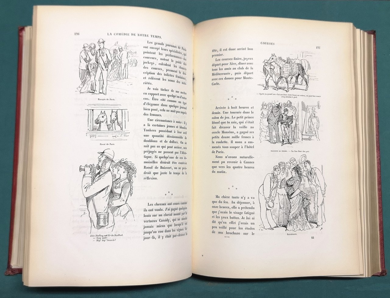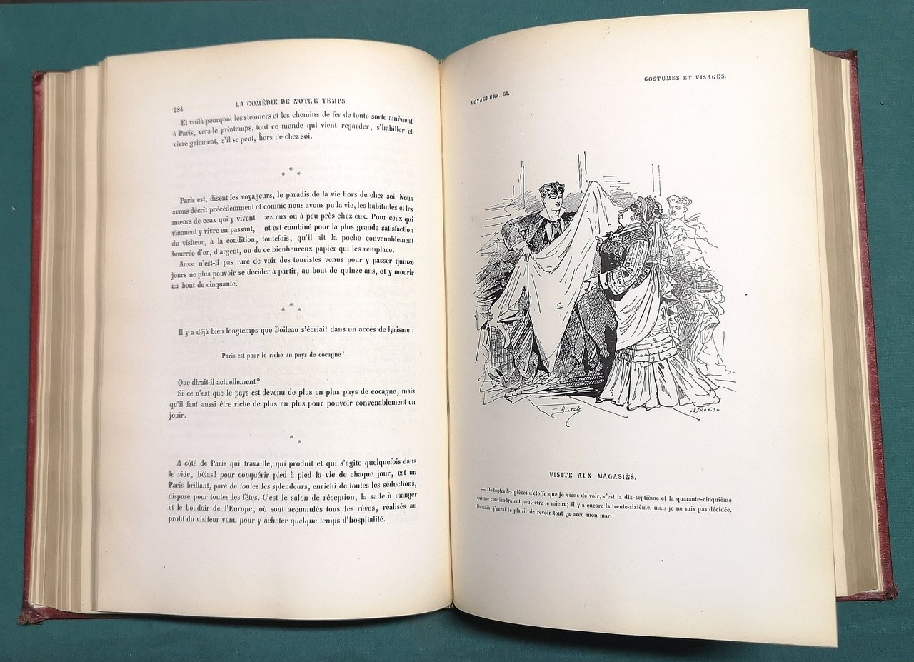>in-8 gr., pp. (4), 668, attraente leg. romantica in m. marocch. rosso, piatti in percallina con riquadri a secco, tit. e fregi oro al dorso, tagli dorati. Illustrato da un gran numero di disegni a piena pagina e vignette n.t., spesso umoristiche, che perlopiù ritraggono personaggi e scene di costume. Edizione originale, prima tiratura. Bertall (Parigi 1820-1882) fu disegnatore, incisore su legno e pietra, uno degli illustratori più fecondi della seconda metà dell'Ottocento. Perfetto esemplare. Carteret III, p.89