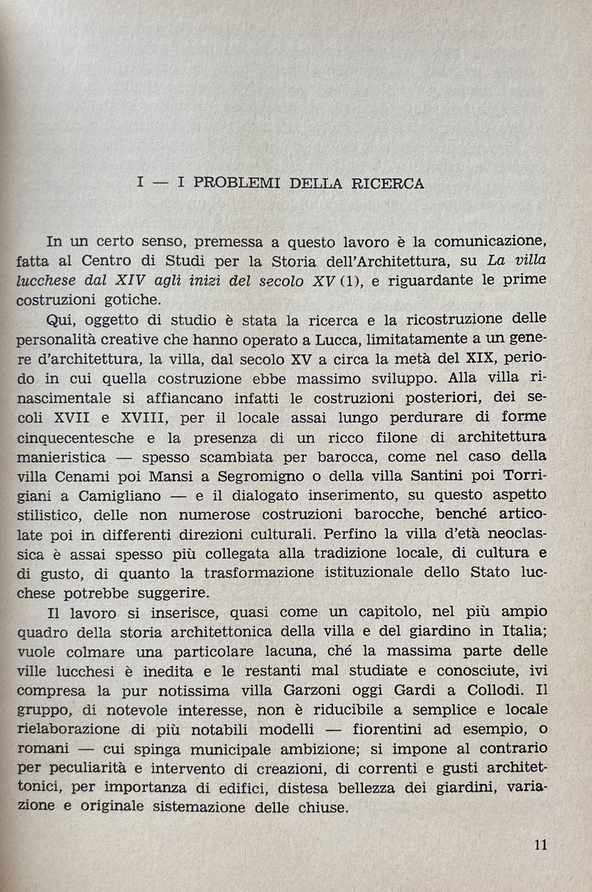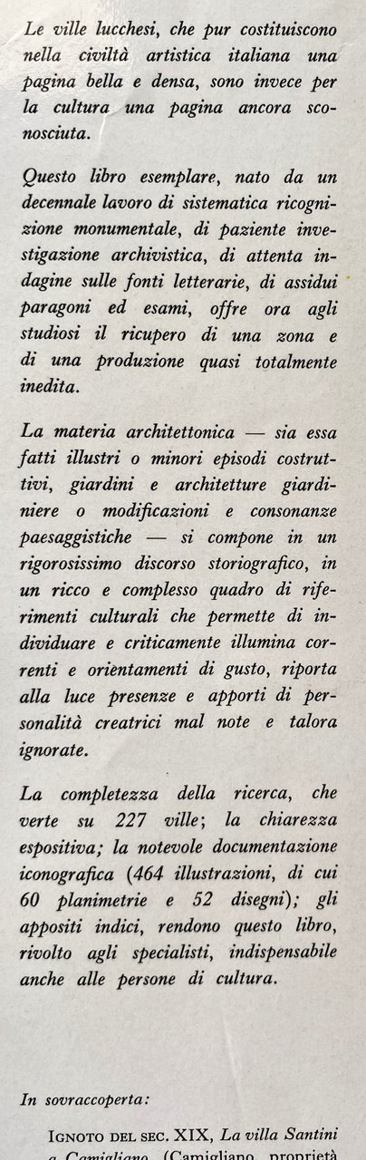 Le ville lucchesi, che pur costituiscono nella civiltà artistica italiana una pagina bella e densa, sono invece per la cultura una pagina ancora sconosciuta. Questo libro esemplare, nato da un decennale lavoro di sistematica ricognizione monumentale, di paziente investigazione archivistica, di attenta indagine sulle fonti letterarie, di assidui paragoni ed esami, offre ora agli studiosi il ricupero di una zona e di una produzione quasi totalmente inedita. La materia architettonica sia essa fatti illustri o minori episodi costruttivi, giardini e architetture giardiniere o modificazioni e consonanze paesaggistiche si compone in un rigorosissimo discorso storiografico, in un ricco e complesso quadro di riferimenti culturali che permette di individuare e criticamente illumina correnti e orientamenti di gusto, riporta alla luce presenze e apporti di personalità creatrici mal note e talora ignorate. La completezza della ricerca, che verte su 227 ville; la chiarezza espositiva; la notevole documentazione iconografica (464 illustrazioni, di cui 60 planimetrie e 52 disegni); gli appositi indici, rendono questo libro, rivolto agli specialisti, indispensabile anche alle persone di cultura.