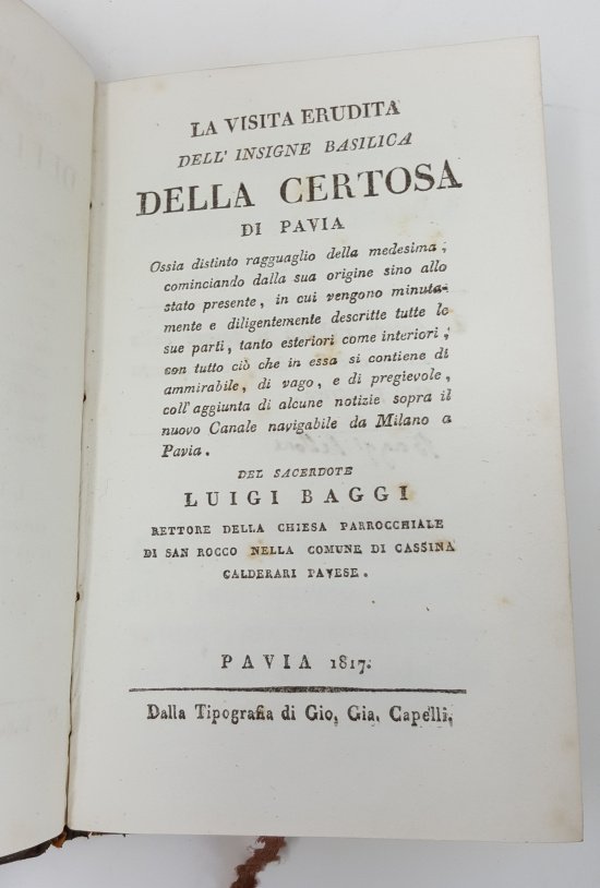 >in-16, pp. (10), 84, bella leg. del tempo p. pelle con bordura oro sui piatti e fregi oro al dorso (forellino sul piatto post.). Ottima guida storico-artistica della celebre Certosa e dei suoi chiostri; le ultime pagine tracciano brevemene la storia del canale di Pavia dal 1400 al 1816. Non comune e ricercata.