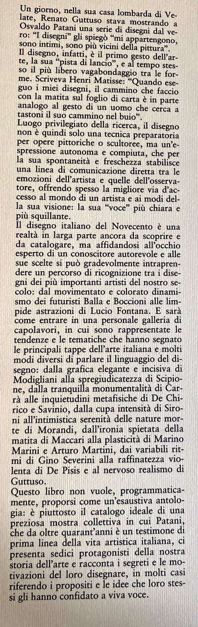 Un giorno, nella sua casa lombarda di Velate, Renato Guttuso stava mostrando a Osvaldo Patani una serie di disegni dal vero: I disegni gli spiegò mi appartengono, sono intimi, sono più vicini della pittura. Il disegno, infatti, è il primo gesto dell'arte, la sua pista di lancio, e al tempo stesso il più libero vagabondaggio tra le forme. Scriveva Henri Matisse: Quando eseguo i miei disegni, il cammino che faccio con la matita sul foglio di carta è in parte analogo al gesto di un uomo che cerca a tastoni il suo cammino nel buio. Luogo privilegiato della ricerca, il disegno non è quindi solo una tecnica preparatoria per opere pittoriche o scultoree, ma un'espressione autonoma e compiuta, che per la sua spontaneità e freschezza stabilisce una linea di comunicazione diretta tra le emozioni dell'artista e quelle dell'osservatore, offrendo spesso la migliore via d'accesso al mondo di un artista e ai modi della sua visione: la sua voce più chiara e più squillante. Il disegno italiano del Novecento è una realtà in larga parte ancora da scoprire e da catalogare, ma affidandosi all'occhio esperto di un conoscitore autorevole e alle sue scelte si può gradevolmente intraprendere un percorso di ricognizione tra i disegni dei più importanti artisti del nostro secolo: dal movimentato e colorato dinamismo dei futuristi Balla e Boccioni alle limpide astrazioni di Lucio Fontana. E sarà come entrare in una personale galleria di capolavori, in cui sono rappresentate le tendenze e le tematiche che hanno segnato le principali tappe dell'arte italiana e molti modi diversi di parlare il linguaggio del disegno: dalla grafica elegante e incisiva di Modigliani alla spregiudicatezza di Scipione, dalla tranquilla monumentalità di Carrà alle inquietudini metafisiche di De Chirico e Savinio, dalla cupa intensità di Sironi all'intimistica serenità delle nature morte di Morandi, dall'ironia spietata della matita di Maccari alla plasticità di Marino Marini e Arturo Martini, dai variabili ritmi di Gino Severini alla raffinatezza violenta di De Pisis e al nervoso realismo di Guttuso. Questo libro non vuole, programmaticamente, proporsi come un'esaustiva antologia: è piuttosto il catalogo ideale di una preziosa mostra collettiva in cui Patani, che da oltre quarant'anni è un testimone di prima linea della vita artistica italiana, ci presenta sedici protagonisti della nostra storia dell'arte e racconta i segreti e le motivazioni del loro disegnare, in molti casi riferendo i propositi e le idee che loro stessi gli hanno confidato a viva voce.