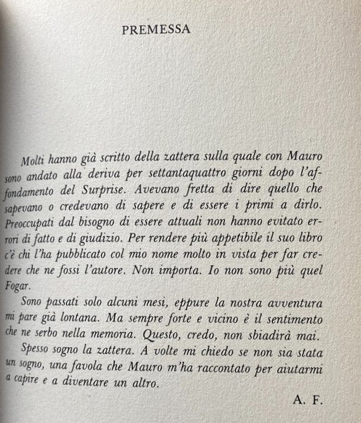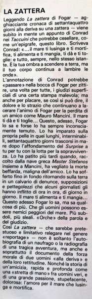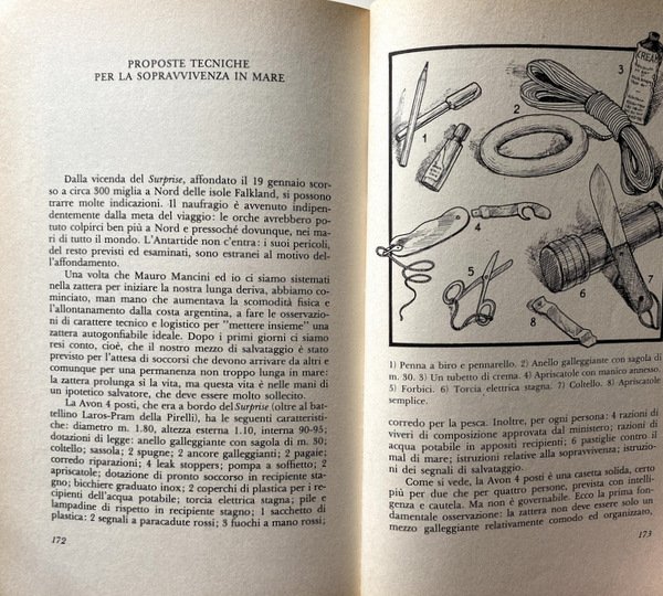 Soggetti: Biografie, Diari, memorie, Storie vere, Naufragi, Deriva, Oceano, Avventura, Racconti autobiografici, Geografia, Viaggio, Libri illustrati, Fotografie d'epoca, Disastri, Disavventure, Libri Vintage Fuori catalogo, Collezionismo, Cronache, Reportage, Conrad, Taccuini, Amicizia, Morte, Lotta, Master Stefanos, Salvataggio, Naufraghi, Verità, Ricostruzioni, Mare, Affondamento, Capodoglio, Balene, Orca, Animali marini, Predatori, Nuova Zelanda, Squali, America, Rio della Plata, Buenos Aires, Argentina, Largo, Zattera, Johannis Kukunaris, Uruguay, Rotta, Navigazione, Correnti oceaniche, Venti, Tempeste marine, Tecniche di sopravvivenza, Narrativa storica, Letteratura, Autobiografie, Timone, Chiglia pneumatica, Scialuppa di salvataggio, Tendalino, Andatura, Galleggiamento, Scarroccio, Poppa, Bolina, Pagliolo, Pagaie, Tubolari, Imbarcazioni di emergenza, Acqua dolce, Sestante, Zattere, Falkland, Affondamento, Anni Ottanta, Esploratori, Giro del mondo, Sport estremi, Bestsellers, Atlantico, Anni Settanta, Contro vento, Navigatori solitari, Eroismo, Circumnavigatori del globo, Velisti italiani, Yacht Surprise, Antartide, Speronamenti, Soccorsi, Biographies, Diaries, Memories, True Stories, Shipwrecks, Drift, Ocean, Adventure, Autobiographical Tales, Geography, Travel, Illustrated Books, Vintage Photographs, Disasters, Misadventures, Out of Print Books, Collectibles, Chronicles, Notebooks, Friendship, Death, Fighting, Rescue, Shipwrecked, Truth, Rebuilding, Sea, Sinking, Sperm whale, Whales, Marine animals, Predators, New Zealand, Sharks, Wide, Raft, Route, Navigation, Ocean currents, Winds, Sea storms, Survival techniques, Historical fiction, Literature, Autobiographies, Rudder, Pneumatic keel, Lifeboat, Awning, Gait, Floating, Drift, Stern, Upwind, Floor, Paddles, Tubular, Emergency boats, Fresh water, Sextant, Rafts, Sinking, Eighties, Explorers, Around the world, Extreme sports, Atlantic, Seventies, Against the wind, Lone navigators, Heroism, Circumnavigators of the globe, Italian sailors, Antarctica, Ramming, Rescues