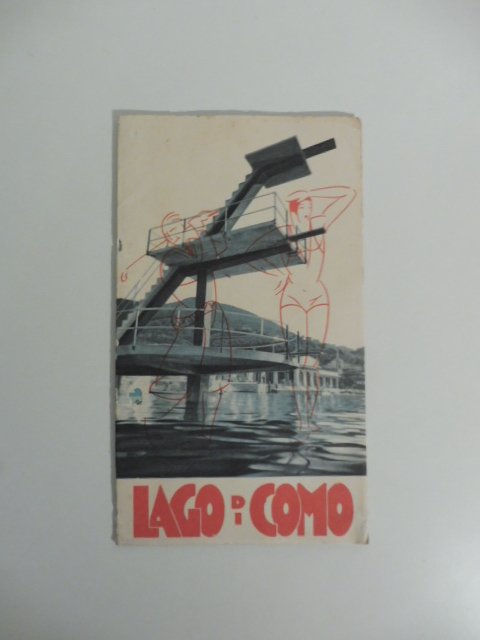 Pieghevole pubblicitario a 6 falde, cm 66 x 19,5 con immagini fotografiche virate in blu. Bella immagine alla brossura editoriale che raffigura il celebre trampolino della Canottieri Lario progettato da Gianni Mantero. Piccole mancanze causate da rosicature. Interessante pieghevole che gioca con la presenza nel territorio della ben nota architettura razionalista.