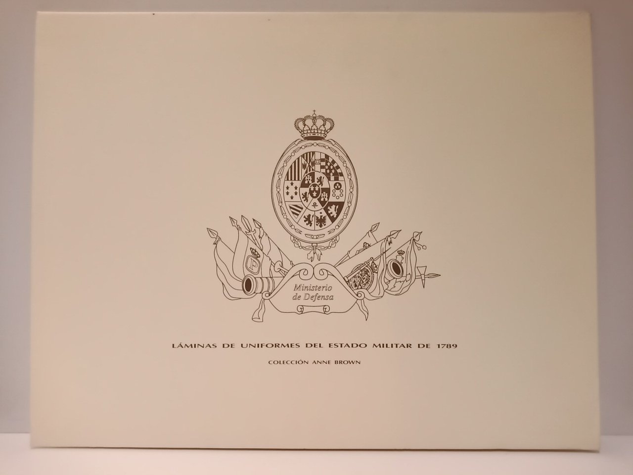 Madrid: Ministerio de Defensa (DRISDE), D.L. 1993.- Conjunto de 9 láminas sueltas a todo color, reproduciendo los originales de la Colección Anne Brown depositados en la Brown University Library; Folio mayor apaisado (33 x 43 cm); Reproducidas en papel de grueso gramaje; Carpeta en Cartulina Ed. con solapas.- Edición limitada de 500 ejemplares. CONTIENE: El Estado Militar de 1789; Casa Real; Infantería española; Infantería extranjera; Caballería; Dragones; Artillería e Ingenieros; Milicias provinciales y urbanas; Infantería de Marina y Brigada de Marina.* EJÉRCITO Y TEMAS MILITARES