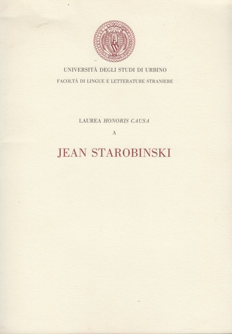 In-4 8Cm 29,5 x 21), pp. 24, brossura editoriale. Stampato in trecento esemplari su carta Fabriano Grifo Vergata in occasione del conferimento della laurea Honoris Causa in Lingue e Letterature straniere al professor Jean Starobinski. Testo in lingua francese di Jean Starobinski, testi di Giovanni Bogliolo (Preside) e Carlo Bo, OTTIMO