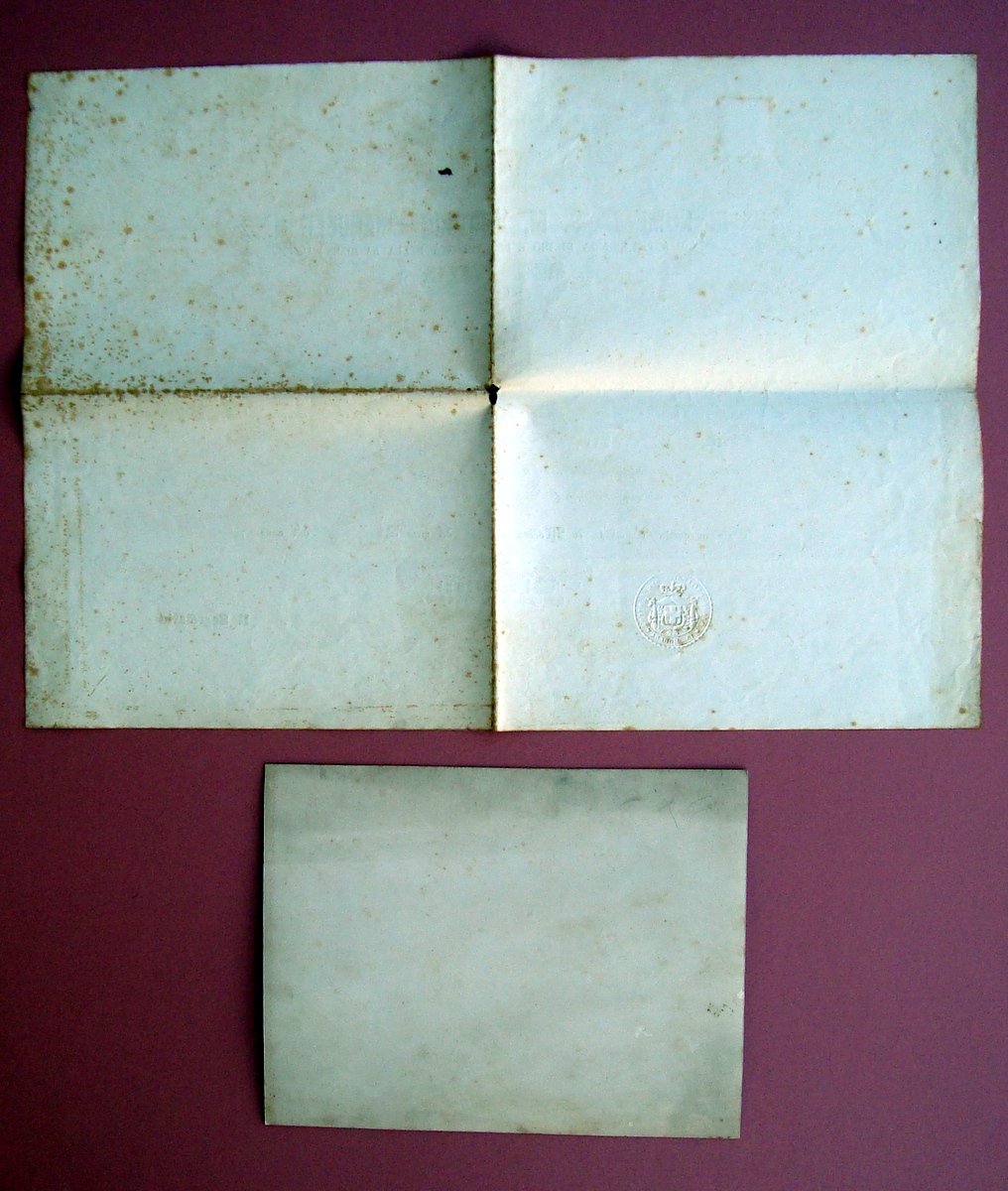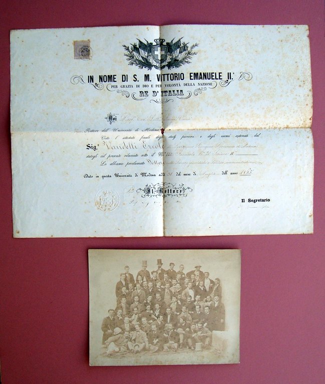 Diploma di Laurea + foto d'epoca, In nome di S.M. Vittorio Emanuele II . Il Sig. Vandelli Ercole di Levizzano Rangone. .proclamato Dottore nelle Scienze giuridiche e Politico amministrative Modena, Luglio 1865; cartonicno d'epoca parzialmente scritto a mano con stemma reale e timbro a secco dell'Università di Modena; cm 37,5x53,5; foto d'epoca altri laureandi di quell'anno cm 21x27. Condizioni di conservazione. Esemplare in buone condizioni con tracce del tempo; pieghe di conservazione che si presentano con macchiette, qualche minuscolo strappetto e piccola mancanza al centro(vedi foto); margini con piccole macchiette e qualche piccolo strappettofoto dei laurendi ben conservata, normali tracce del tempo; per maggiori dettagli vedi foto. Il Vandelli diventerà in seguito notaio con ruoli rilevanti SC03.D16760 blu
