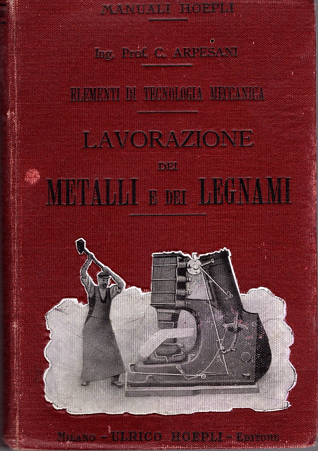 In-16°, pp. XII, 317, (3), 64 di elenco dei Manuali Hoepli, tela cerata granata editoriale con titoli impressi in nero al dorso e al piatto anteriore figurato con tavola applicata b/n, tagli rossi. 274 incisioni nel testo. Bell'esemplare. Prima edizione di questa classica trattazione sulla lavorazione di metalli e legnami (combustibili, forni, fonderie, soffierie etc.).