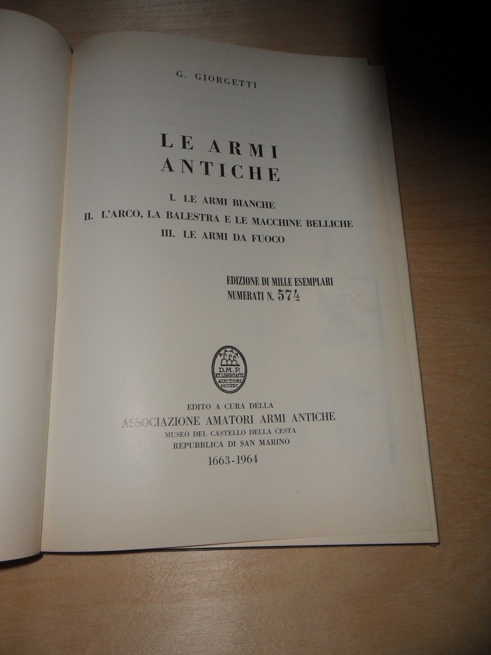 GIORGETTI, le armi antiche. catalogo mostra - I. le armi bianche II. l'arco, la balestra e le macchine belliche III. le armi da fuoco - a cura di associazione amatori armi antiche