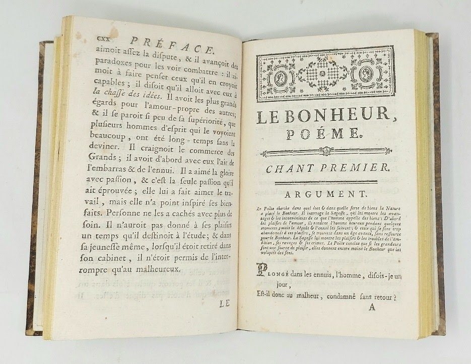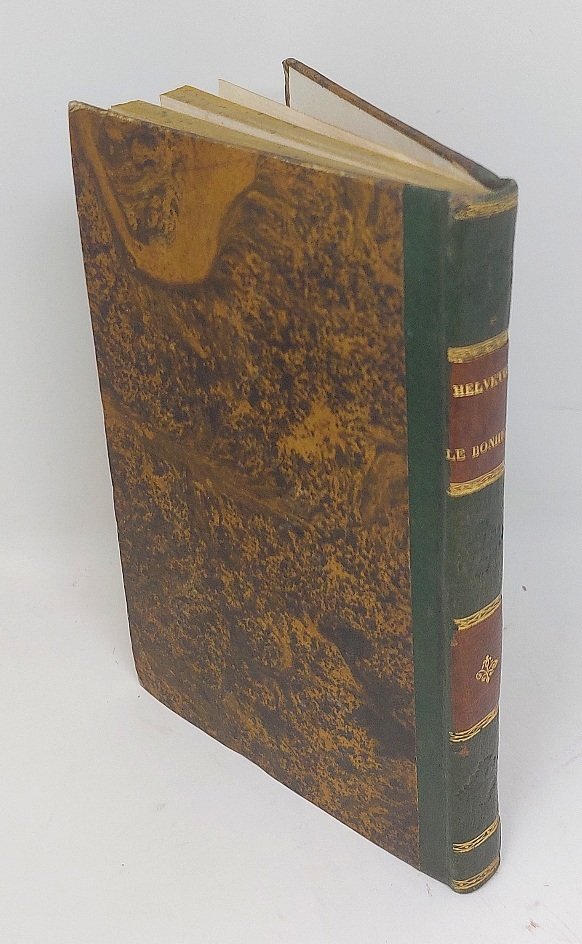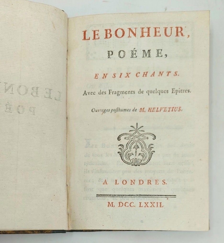 >in-8 (165x105 mm), pp. (4), CXX, 116. Due parti nell'edizione: I - Préface par M***, ou Essay sur la vie & les Ouvrages de M:Helvetius. II - ''Le Bonheur, poémeen six Chants'' (pp.102), seguite in fine da ''Fragments de quelques écrits'', (pp. 103-116). Titolo in rosso e nero, fregi tipografici sulle pagine dei poemi. Legatura 800sca in mezza pelle verde, titolo e fregi in oro al dorso, tagli gialli. Edizione originale, non comune, del noto poema ''Le Bonheur" di Helvetius (Paris 1715-1771), preceduta dalla dotta prefazione letterario-biografica di Saint-Lambert. Ottimo esemplare. Tchemerzine, VI, 190. Cioraneswco 33639.