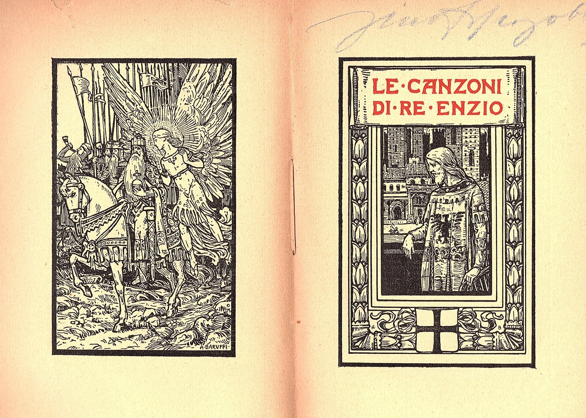 In-16° (19x12 .5 cm), pp. (8), 74 (6) brossura editoriale verde con titolo in rosso e illustrazione xilografica in nero raffigurante il Re Enzio e, sullo sfondo, le torri felsinee medievali. Il frontespizio riproduce la stessa xilografia del piatto anteriore; antiporta xilografica figurata e 13 incisioni xilografiche b/n nel testo dello stesso Baruffi. PIù che buon esemplare entro velina orfano della sovracoperta. Prima edizione. Otto canzoni. 'Opera del periodo bolognese e dedicata, quasi un tributo d'omaggio, alle memorie di quella città. Comprende tre parti o canzoni: 'La canzone del Carroccio', 'La canzone del Paradiso', 'La canzone dell'Olifante'. Di qui il titolo, con riferimento alle 'chansons de geste', di cui riproduce il metro in lasse di endecasillabi chiusi da un settenario, e il tono che vuol essere epico-eroico, conveniente alla materia trattata, storica e leggendaria insieme: la storia del comune bolognese nel suo momento più glorioso, dopo la battaglia di Fossalta e la cattura di re Enzio, figlio di Federico II. Di qui ha inizio il racconto: tutto il popolo si prepara ad andare incontro ad Innocenzo IV, lungo la via Emilia, schierato intorno al Carroccio vittorioso. (.) Segue la 'Canzone del Paradiso', di contenuto in gran parte idillico, col racconto degli amori di Enzio con una schiava del contado, Flor d'Uliva. E' qui una delle pagine più belle del Pascoli di poesia d'amore.' (Carlo Curto, in Diz. Bompiani d. Opere, II, pag. 90). Cfr. Gambetti - Vezzosi, p. 645.