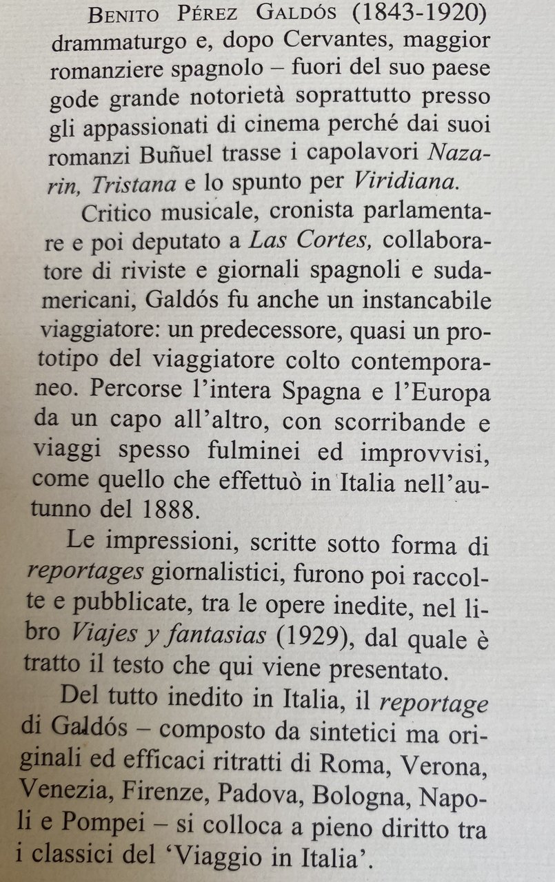 BENITO PÉREZ GALDOS (1843 drammaturgo e, dopo Cervantes, maggior romanziere spagnolo, fuori del suo paese gode grande notorietà soprattutto presso gli appassionati di cinema perché dai suoi romanzi Buñuel trasse i capolavori Nazarin, Tristana e lo spunto per Viridiana. Critico musicale, cronista parlamentare e poi deputato a Las Cortes, collaboratore di riviste e giornali spagnoli e sudamericani, Galdós fu anche un instancabile viaggiatore: un predecessore, quasi un prototipo del viaggiatore colto contemporaneo. Percorse l'intera Spagna e l'Europa da un capo all'altro, con scorribande e viaggi spesso fulminei ed improvvisi, come quello che effettuò in Italia nell'autunno del 1888.