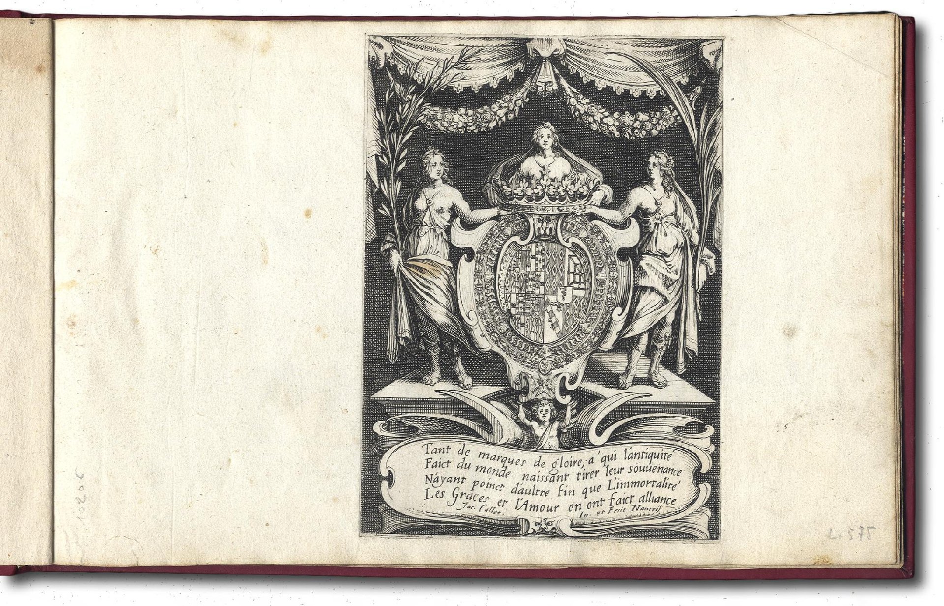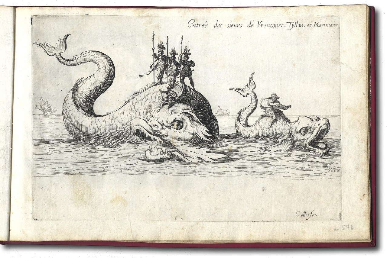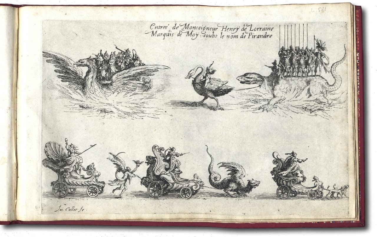 >In-8 oblungo (mm 157x110). Serie completa di 10 acqueforti, (frontespizio incluso) e cm. 15x24 ca. ognuna (tavole), legatura moderna in marocchino rosso con fregi angolari vegetali in oro, al contropiatto anteriore inserto in pelle con autore e titolo. Tutte le incisioni sono in stato unico ad eccezione del Frontespizio, secondo stato su tre (Lieure n. 575), dell'Entrée de MM. de Vroncourt, Tyllon et Marimont, primo stato su due (Lieure n. 578) e de Le Défilé à pied, secondo stato su due (Lieure n. 583). Il frontespizio presenta tre figure femminili che sorreggono lo stemma della dedicataria, 7 incisioni rappresentano i carri della festa e 2 la sala del torneo, nel palazzo ducale di Nancy. La festa ebbe luogo il 14 febbraio 1627 in onore della Duchessa di Chevreuse. Il resoconto fu pubblicato da Henry Humbert e le stampe di Callot servirono ad illustrare l'opera. Rarissimo a fogli non piegati in quanto generalmente le tavole venivano rilegate in-8 a misura del frontespizio. Jules Lieure, Jacques Callot. Catalogue raisonné de l'oeuvre gravé. Tome I - Texte, Tome II - Planches, Revisited Edition by Alan Wofsy, San Francisco, 1989, pp.73-77, nn. 575-584; pl. 575-584.