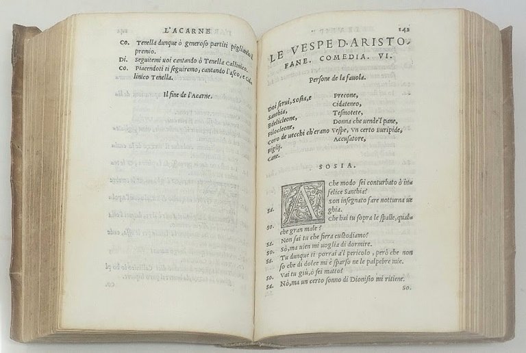 >in-8, ff. 304, leg. coeva p. perg. molle con unghia, tit. ms. al dorso. Impresa tipogr. al titolo ed in fine, iniz. silogr., testo in bel car. corsivo. Dedica dei traduttori a Camill o de Gambara. Prima traduzione in lingua italiana ed in qualsiasi altra lingua del "corpus" delle 11 commedie superstiti di Aristofane (le traduzioni in francese, tedesco ed inglese apparvero solo nel XVII secolo). Commedie in prosa, senza divisione in atti, questi undici testi teatrali (unici a noi pervenuti dei 44 attribuiti dagli antichi al commediografo) sono quanto di più brioso, vivace e ricco di "gioia di vivere", come è stato scritto, che mai sia stato rappresentato sul palcoscenico. Ottimo esempl. (forellino sul tit. dovuto ad abrasione di antico timbro). Manca a Regenstein. Clubb 739 (Rositini). BMC 42. Adams A-1721.