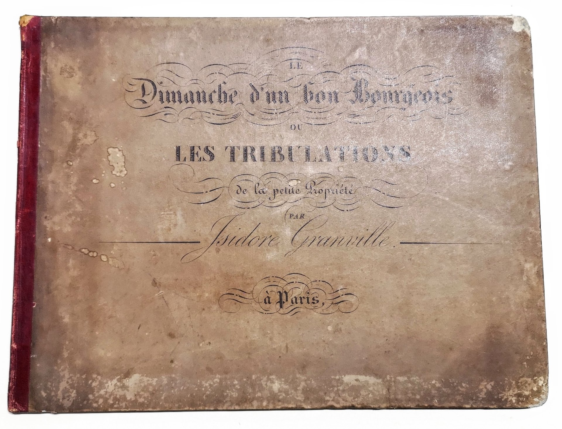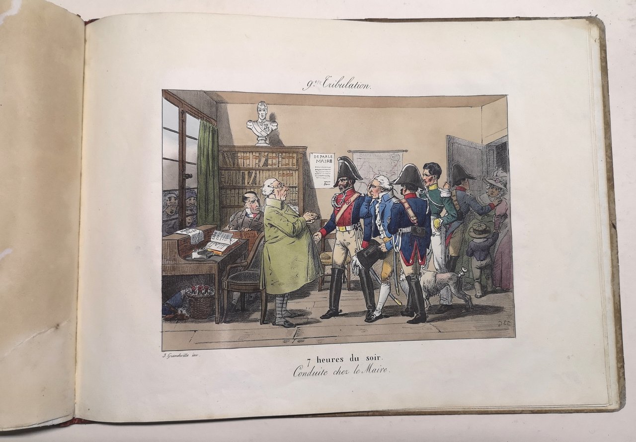 >album in-4 oblungo (340 x 258 mm) , leg. edit. in m. pelle rossa con filetti in oro al dorso e piatti in cartone, titolo litografato al piatto ant. (leggermente usurato). Suite completa di 12 litografie colorate a mano. Il nome dell'illustratore è scritto "Isidore Granville" sul titolo mentre le tavole sono correttamente firmate "J. Grandville". Prima collezione litografica di Grandville, che aveva precedentemente pubblicato due litografie separate e 15 litografie di costumi teatrali (1825). Sequenza satirica sulla vita borghese; sotto l'influenza della caricatura inglese, Grandville prende in giro le feste di campagna e le cene all'aperto delle famiglie ricche della capitale. Buon esemplare, piccoli restauri a strappi marginali su alcune tavole.