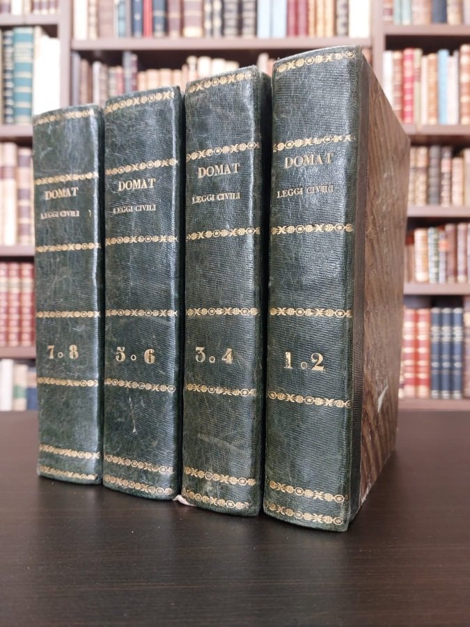 <span style="font-style: normal;">8 volumi (di 9) in 4 in-8° (cm. 19,3), legature coeve in mezza pelle verde con titoli e fregi in oro ai dorsi (lievi abrasioni ai piatti), tagli spruzzati in blu; carte in stato molto buono (lievi e sporadiche fioriture). </span><i>Prima edizione veneta eseguita sulla traduzione di Napoli, rettificata in varj luoghi dal dottor Giuseppe Andrea Zuliani. Aggiuntavi una di lui analisi sulle leggi civili dello Statuto veneto</i>. Cfr. Cicogna 1238. Buon esemplare. (SF4)
