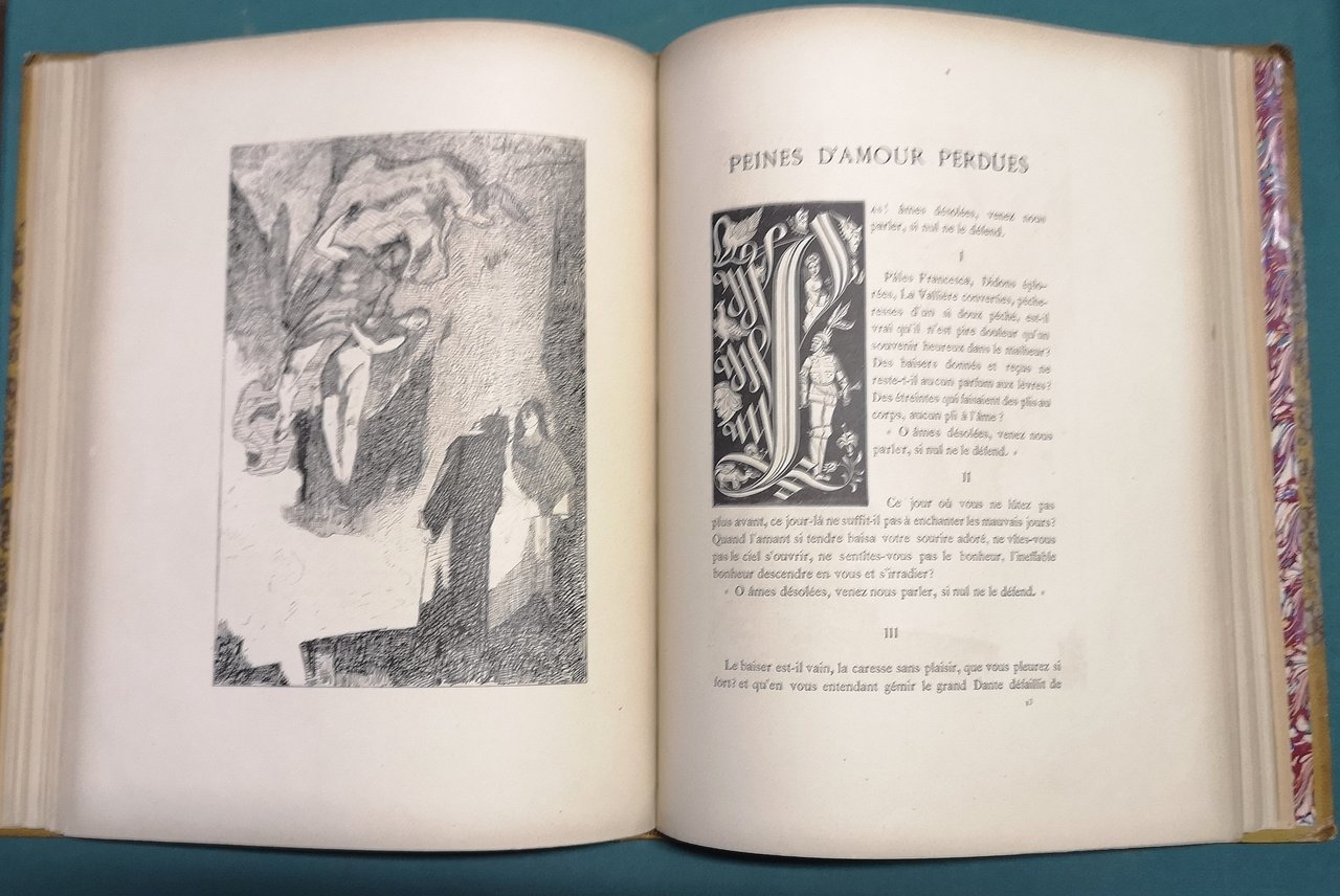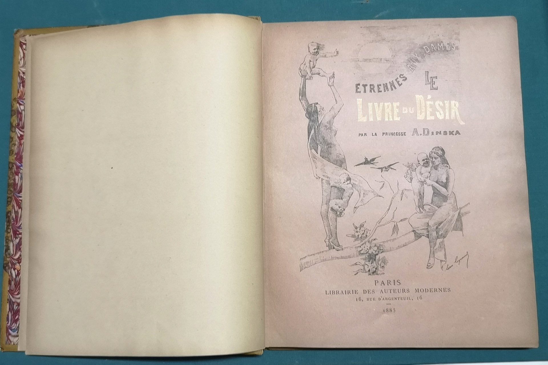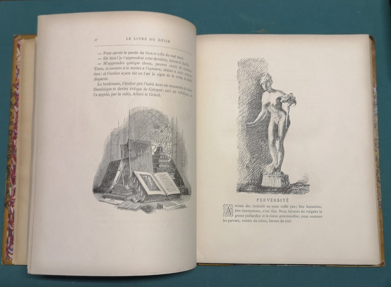 >in-4, pp. 150, (6) di indici, frontespizio figurato di Louis Legrand e decine di testatine, finalini, vignette e tavole a piena pagina. Legatura coeva in mezzo marocchino e angoli, titolo su tassello in pelle al dorso, taglio superiore dorato, brochure editoriale figurata in nero conservata. Edizione originale, impressa in soli 517 esemplari numerati (n. 61 su carta teinté), di antologia di poesia e testi relativi al desiderio femminile e graziosamente illustrata in tipico gusto romantico. Rarissima a trovarsi in commercio. Perfetto esemplare.