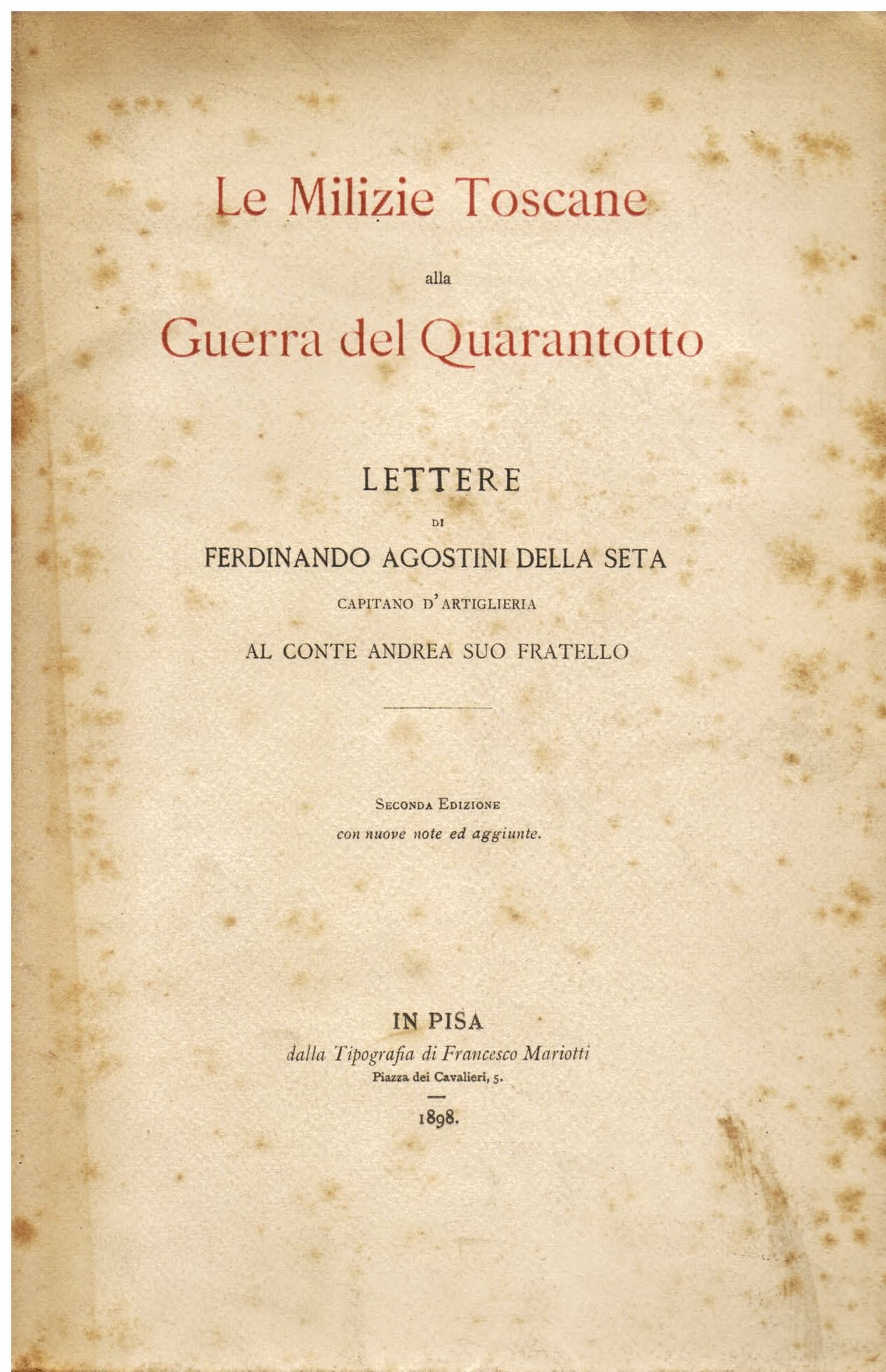 Le Milizie Toscane alla Guerra del Quarantotto. Lettere al conte Andrea suo fratello. Seconda edizione con nuove note ed aggiunte | Libros antiguos y modernos | Agostini Della Seta Ferdinando