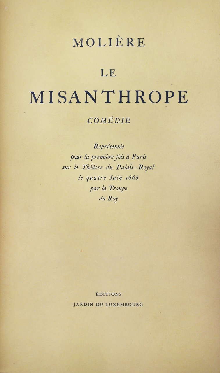 LE MISANTHROPE. - Comédie. Représentée pour la première fois à Paris sur le Théâtre du Palais-Royal, le quatre Juin 1666, par la Troupe du Roy.