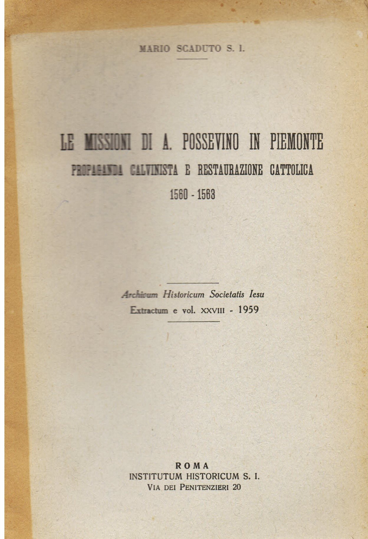 Le missioni di A. Possevino in Piemonte. Propaganda calvinista e restaurazione cattolica. 1560 - 1563. Archivium Historicum Societatis Iesu. Extractum e vol. XXVIII - 1959