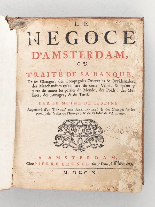 1 vol. in-4 reliure de l'époque plein vélin blanc, Chez Pierre Brunel, Amsterdam, 1710, 2 ff. (titre puis avertissement et errata), 388 pp. et 1 f. n. ch. (tables) Titre complet : Le Négoce d'Amsterdam, ou Traité de sa Banque, de ses Changes, des Compagnies Orientales & Occidentales, des Marchandises qu'on tire de cette Ville, & qu'on y porte de toutes les parties du Monde, des Poids, des Mesures, des Aunages, & du Tarif. Par Le Moine de l'Espine. Augmenté d'un Traité des Arbitrages, & des Changes sur les principales Villes de l'Europe, & de l'Ordre de l'Amirauté [ Titre complet du Traité des Arbitrages : ] Traité des Arbitrages qui se font par Change sur les principales Villes de l'Europe, ou la Ville d'Amsterdam à Change ouvert. Avec un Traité des Changes Curieux, & tres-utile pour tous les Négocians, fait & expliqué en François par Jacques Mondoteguy, Bayonnais Etat moyen (grignotage de rongeur au mors en texte, affectant les 45 premiers feuillets mais n'affectant pas le texte, des mouill.) pour ce texte rare. Une première édition avait paru en 1694 ; celle-ci, vraisemblablement posthume, est enrichie d'un Traité des arbitrages rédigé par le bayonnais Jacques Mondoteguy. Prix en l'état