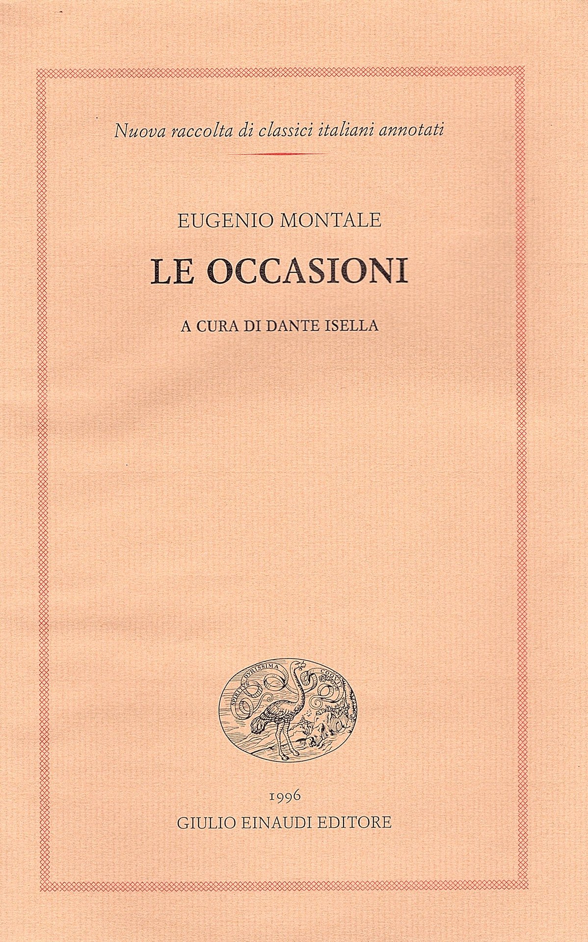 In-8° (22x15 cm), brossura editoriale a risvolti con titoli in rosso e nero al dorso e al piatto anteriore. Pp XVII, 249, (5). Nuova raccolta di classici italiani annotati diretta da Cesare Segre, 14. Ottimo esemplare a fogli chiusi protetto da velina conservante la scheda bibliografica Einaudi Ottobre 1996. Edizione filologica di riferimento della classica suite poetica montaliana per celebrare il centesimo anniversario della nascita del poeta premio Nobel. Prima opera del Novecento ad essere ospitata in questa collana.