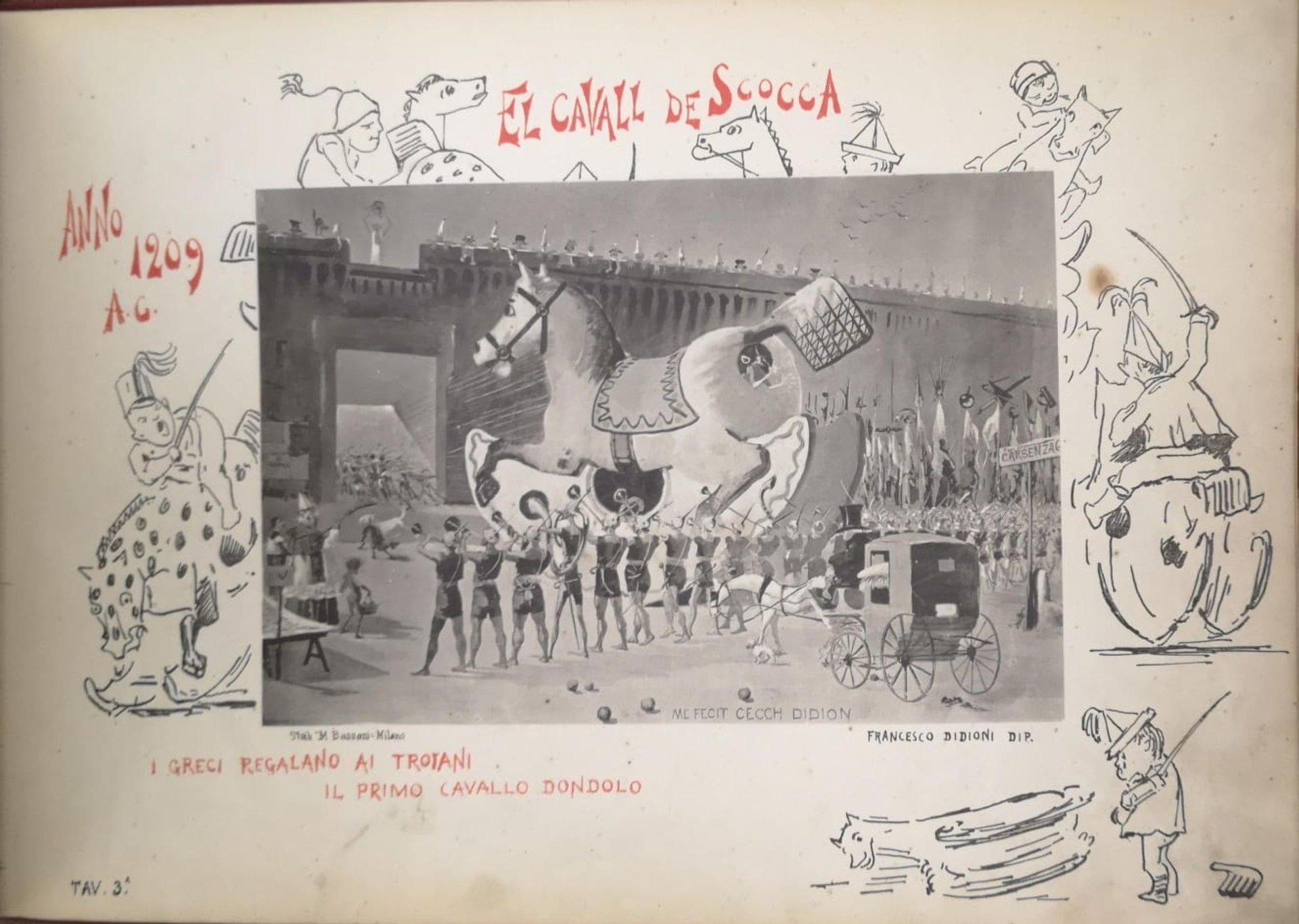 Album in-8 p. (mm. 220x317), tela editoriale, pp. (4), seguite da 15 tavole in bianco e nero fuori testo, disegnate da R. Armenise, L. Bianchi, V. Bignami, G. Campi, L. Cima, E. Conti, E. Crespi, G. Crespi, F. Didioni, A. Dovera, G. Mantegazza, A. Morbelli, P. Sala, G. Stabilini, G. Todeschini e A. Villa. Ogni tavola è preceduta da una pag. che contiene la spiegazione dei giuochi e della loro origine esposta in forma di dialogo o talora in poesia italiana, dialettale o anche maccheronica. Autori dei testi: Vespasiano Bignami, Pacifico Camisasca, Camillo Cima, Cletto Arrighi, Crespi Gaetano, Mangili Enrico e G.V.V. Trattasi solamente dei giuochi di Milano e del suo contado. Cfr. Cat. Hoepli, 651. Ben conservato.
