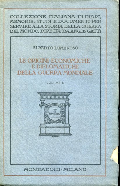 2 voll. in-8°, pp. ,544, (2); 612; brossure editoriali azzurre con vignetta di Cisari. Ottimo stato. Prima edizione di uno dei più organici tentativi compiuti dalla storiografia italiana della prima metà del '900 di individuare i fattori salienti che condussero allo scoppio del primo conflitto mondiale. Il Lumbroso (Torino, 1872-ivi, 1942), direttore della 'Rivista di Roma' e fondatore della 'Revue Napoléonienne', fu illustre storico del nostro Risorgimento, del Primo Impero francese e delle origini politico-diplomatiche della Prima Guerra Mondiale, nonché biografo della Regina Elena. Collezione italiana di diari, memorie, studi e documenti per servire alla storia della Guerra del Mondo, diretta da Angelo Gatti.