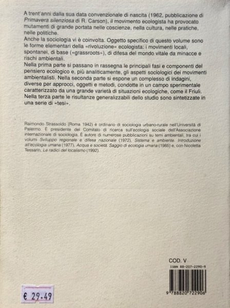 Le forme elementari della "rivoluzione" ecologista: i movimenti locali, spontanei, di base (grassroots), di difesa del mondo vitale da minacce e rischi ambientali. Nella prima parte si passano in rassegna le principali fasi e componenti del pensiero ecologico e, più analiticamente, gli aspetti sociologici dei movimenti ambientalisti. Nella seconda parte si espone un complesso di indagini, diverse per approcci, oggetti e metodi, condotte in un campo sperimentale caratterizzato da una grande varietà di situazioni ecologiche, come il Friuli. Nella terza parte le risultanze generalizzabili dello studio sono sintetizzate in una serie di "tesi".