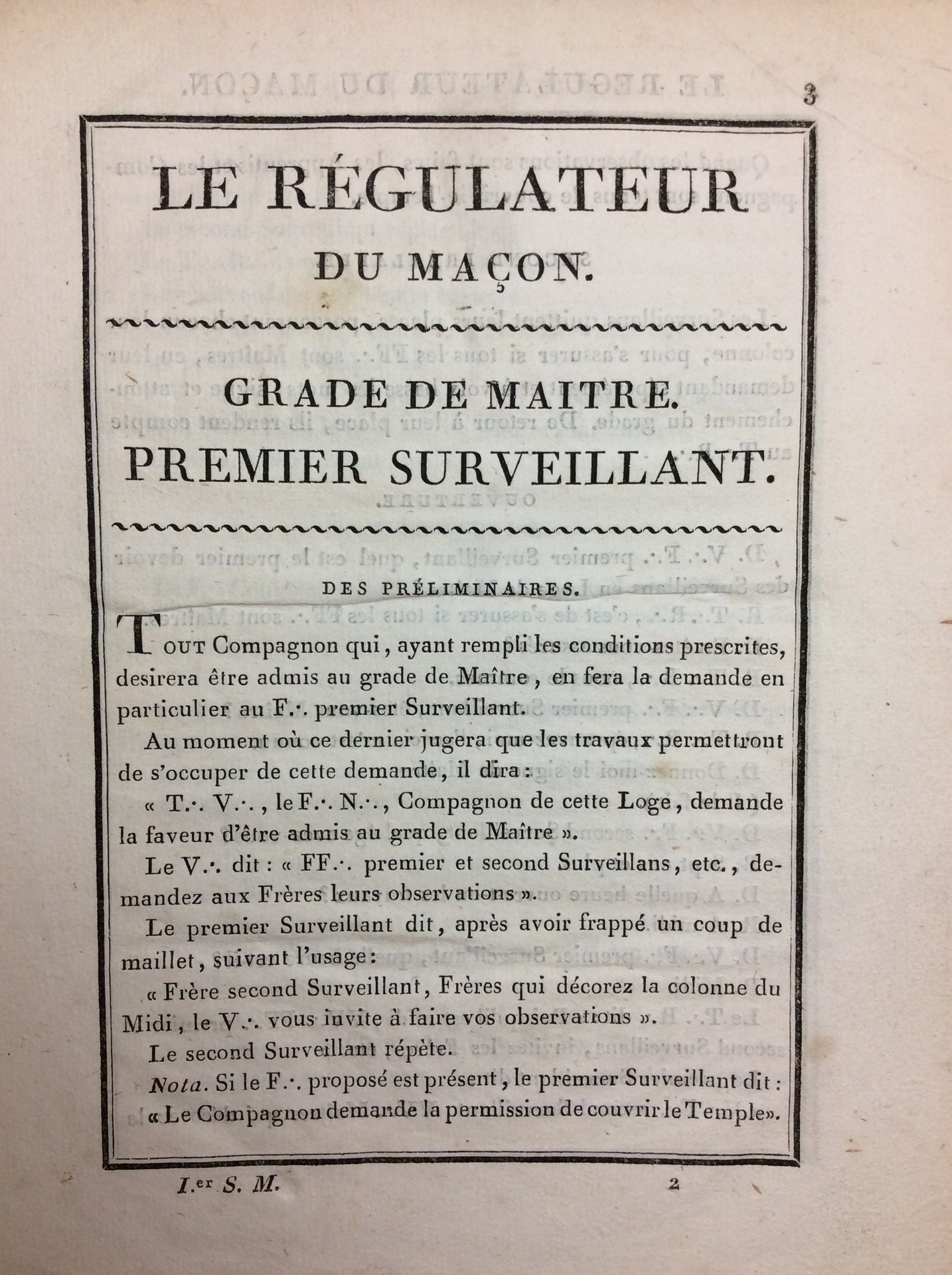 In-8 p. (mm. 234x190), 4 plaquette, brossura muta coeva. Vi sono contenuti: - Grade de Maitre. Premier Surveillant, pp. 11- Grade de Maitre. Second Surveillant, pp. 10- Grade de Compagnon, pp. 22- Troisieme grade, ou grade de Maitre, pp. 32 (brossura con strappi) Ben conservati.