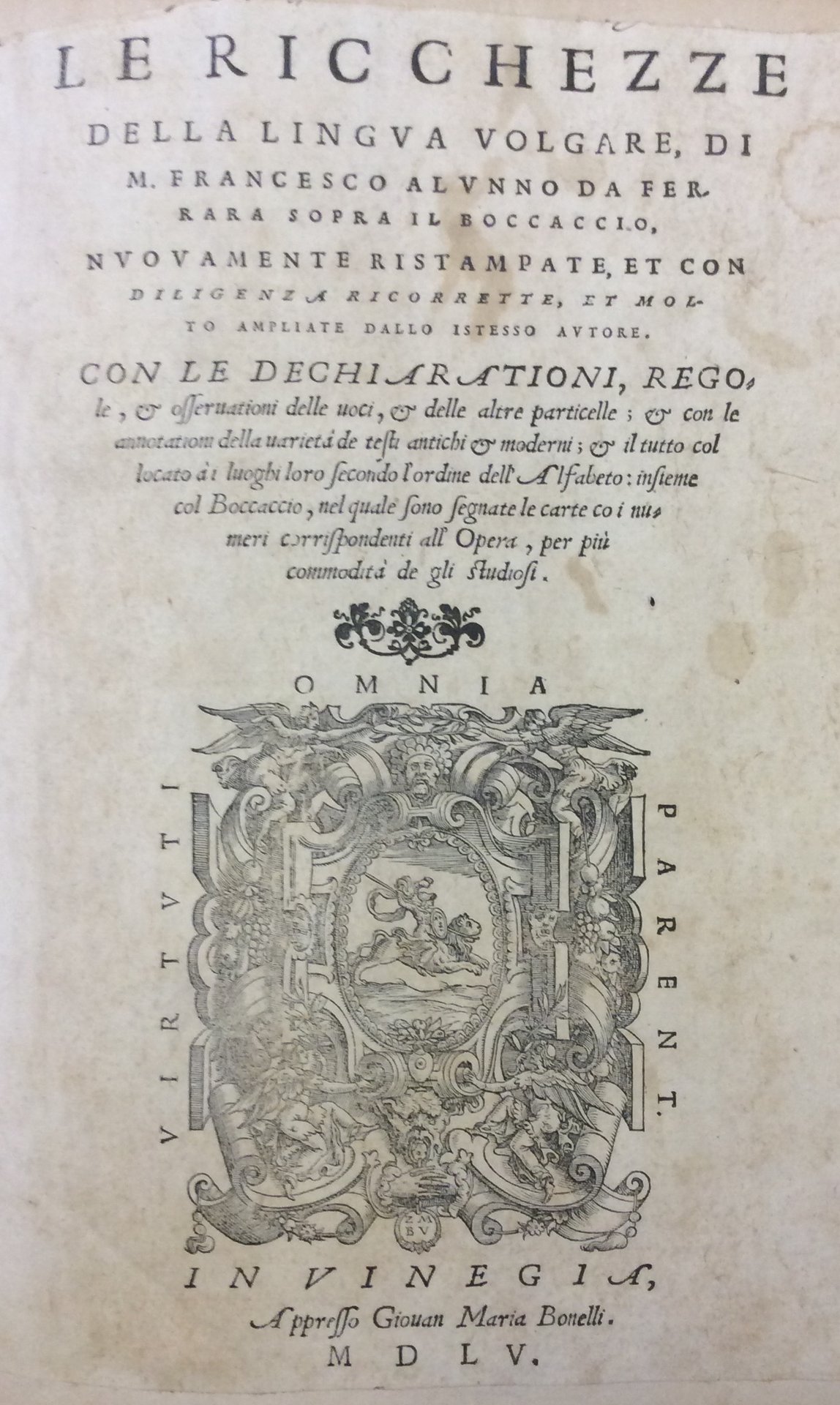 LE RICCHEZZE DELLA LINGUA VOLGARE SOPRA IL BOCCACCIO. - Nuovamente ristampate, et con diligenza ricorrette, et molto ampliate dallo istesso autore. Con le dechiarationi, regole, & osservationi delle voci, & delle altre particelle; & con le annotationi della varietà de testi antichi & moderni; & il tutto collocato à i luoghi loro secondo l'ordine dell'Alfabeto: insieme col Boccaccio, nel quale sono segnate le carte co i numeri corrispondenti all'Opera, per più commodità de gli studiosi.
