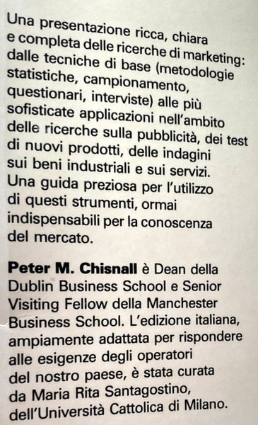 Soggetti: Economia Aziendale, Marketing, Statistica, Discipline aziendali, Manuali, Studi economici, Commercio, Produzione, Mercato, Consumatori, Pubblicità, Reclame, Prodotti, Merci, Servizi, Clienti, Persuasione, Propaganda, Gestione d'impresa, Strategie, Strategia, Gestione, Libri universitari e professionali, Bibliografia, Classici, Riferimento, Ricerche, Questionari, Metodologie, Tecniche, Industria, Business, Comportamento, Consumer Behaviour, Analisi, Mass media, Comunicazione, Tecnologia, Dati, Panel Research, Testmarketing, Advertising, Psicologia, Scienze sociali, Sociologia, Teorie economiche, Produttori, Grandi marchi, Marchio, Promozioni, Prezzo ottimale, Lancio, Posizionamento competitivo, Domanda, Target, Evoluzione, Segmentazione, Tabelle, Diagrammi, Grafici, Posizionamento, Distribuzione, Campione, Calcolo, Vendita, Osservazioni, Osservatorio, Istituti, Etica, Negoziazione, Compratori, Attitudini, Sviluppo, Internet, Online, Logistica, Oligopolio, Monopolio, Seduzione, Influenza, Tradizioni culturali, Identità, Iconografia, Immaginario, Sondaggi, Companies, Rischio, Investimenti, Pianificazione, Manifattura, Competitors, Esportazioni, Concentrazione, Capitale, Innovazione, Acquisto, Trend, Cultura, Moda, Stima, Campionamento, Interviste, Indagini, Beni industriali, Globalizzazione, Kellogg's, Colgate, Nestlé, General Foods, Mars, Gastronomia, Cibo, Automobili, Profumi, Gioielli, Abbigliamento, Palmolive, Classificazioni, Popolazione, Audit, Banche, Industrie, Stati Uniti, Nielsen, POS, Demskopea, ISTAT, IMS, SITA, AGB, Codici a barre, Taylor Nelsen, Omnibus, Indagini telefoniche, Test, Risultati, Televisione, Radio, ACORN, ABACUS, DOXA, BURKE, EXPLORER, SAGACITY, Cluster, Stampa, Editoria, Quotidiani, Riviste, Decision Making, Business Administration, Statistics, Business Disciplines, Manuals, Economic Studies, Commerce, Production, Market, Consumers, Advertising, Products, Goods, Services, Customers, Persuasion, Management, Strategies, Strategy, Management, University and professional books, Bibliography, Classics, Reference, Research, Questionnaires, Methodologies, Techniques, Industry, Business, Analysis, Communication, Technology, Data, Psychology, Social sciences, Sociology, Economic theories, Manufacturers, Big brands, Brand, Promotions, Optimal price, Launch, Competitive positioning, Demand, Evolution, Segmentation, Tables, Diagrams, Graphs, Positioning, Distribution, Sample, Calculation, Sale, Observations, Observatory, Institutes, Ethics, Negotiation, Buyers, Attitudes, Development, Logistics, Oligopoly, Monopoly, Seduction, Influence, Cultural traditions, Identity, Iconography, Imaginary, Surveys, Risk, Investments, Planning, Manufacturing, Exports, Concentration, Capital, Innovation, Purchase, Culture, Fashion, Estimate, Sampling, Interviews, Investigations, Industrial goods, Globalization, Gastronomy, Cars, Perfumes, Jewelry, Clothing, Classifications, Population, Banks, Industries, United States, Barcodes, Telephone inquiries, Results, Television, Press, Publishing, Newspapers, Magazines