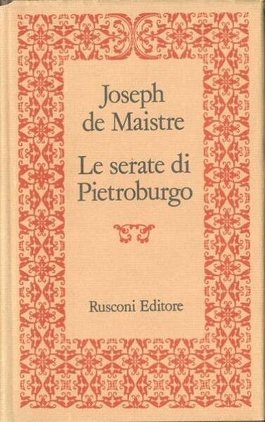 XXXIX, 742 p., [1] c. di tav. : ritr. ; 21 x 14 cm . Tradizione. L'opera è un dialogo, capolavoro letterario di Joseph de Maistre, pubblicato postumo dal figlio Rodolphe nel 1821. Nell'opera, suddivisa in undici colloqui fra tre personaggi immaginari, (il Conte, piemontese; il Senatore, russo; il più giovane Cavaliere, francese) si mettono in scena discussioni fra i tre detti personaggi, che si trovano ad affrontare i più svariati temi relativi al senso della vita, della morte e della storia, oltre che del bene e del male e delle loro conseguenze. Edizione italiana a cura di Alfredo Cattabiani. Traduzione dal francese di Lorenzo Fenoglio e Anna Rosso Cattabiani. In appendice il trattato di Plutarco "Perché la giustizia divina punisce tardi" nella versione e con il commento di Joseph de Maistre. Titolo originale dell'opera: «Les Soirees de Saint-Petersbourg, ou Entretiens sur le gouvernement temporel de la Providence». Traduzione dal greco e dal francese di Costanza Coccià. Legatura editoriale, coperta in cartone rigido telato colorato (marrone), col titolo impresso in oro al dorso, muto al piatto. Sovraccoperta illustrata a colori. Un ritratto del conte Joseph de Maistre dalla collezione della famiglia de Maistre. Tagli leggermente bruniti del tempo, firma di appartenenza nell'occhietto, per il resto esemplare integro. Codice libreria 7821.