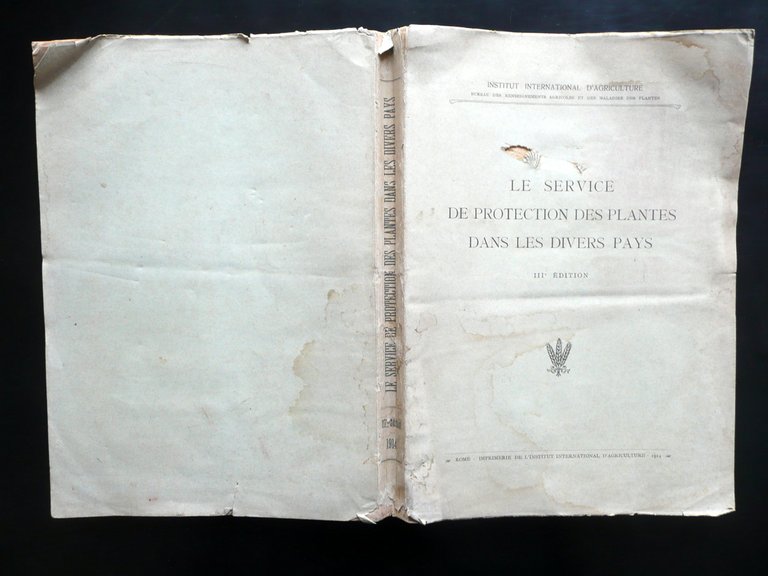 AA. VV., Institut International d'Agriculture Bureau des renseignements agricoles et des maladies del plantes - Le service de protection de plantes dans le divers pays III° edition Imprimerie de l'Institut International d'Agriculture, Rome 1914; cm 31x21,5; pp. XVI-355 con una tavola in b/n rip. più volte fuori t.; brossura ed. Testo in francese. Condizioni di conservazione Esemplare complessivamente ben conservato con tracce d'uso, brossure con qualche leggera gora dovuta a vecchia umidità, le quali non interessano le pagine; brossura ant. con un paio di piccoli strappetti e due minime mancanze; cuffie del dorso con piccoli strappetti e una piccola mancanza. Interni buoni con leggere bruniture; angolo sup. di alcune pagine con pieghetta; tavola rip. più volte con qualche ingiallitura e un piccolo strappetto a un margine esterno. Testo in francese. SETT153.L14495 N