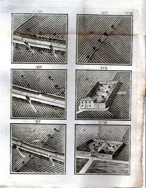 in-8 gr., pp. 37, 24, bross. edit. con cornici xilogr. e vignetta ai piatti (manca la carta al d.). Con 24 tavv. inc. in rame ripp. al fine raff. le servitù di vario genere sui fondi rustici. Le tavv. sono estremamente chiare per l’interpretazione dei vari casi che si presentano sia per motivi di confine e per altri motivi. Opera celebre e molto ricercata per la sua specificità. Sono esposti anche alcuni problemi idraulici. Fresco esempl. in barbe, con le tavole inc. su carta forte e marginose. Dif. al d. [104]