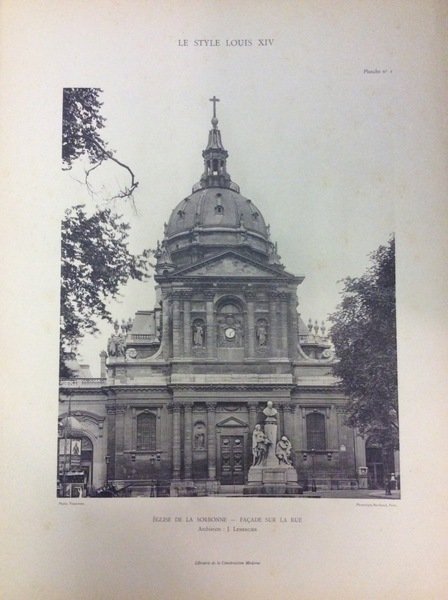 In folio (mm. 455x329), cartella mod. in mz. tela con legacci, contenente pp. X,(2) e una raccolta di 140 tavole fotografiche con 206 esempi di "palais, chateaux, monuments publics, hotels particuliers, maisons, églises, etc.: vues extérieures et intérieures, détails d'architecture et de sculpture décorative à grande échelle. Nel testo: "Histoire et biographies des principaux architectes français du XVII siècle". Tavv. ben conservate.