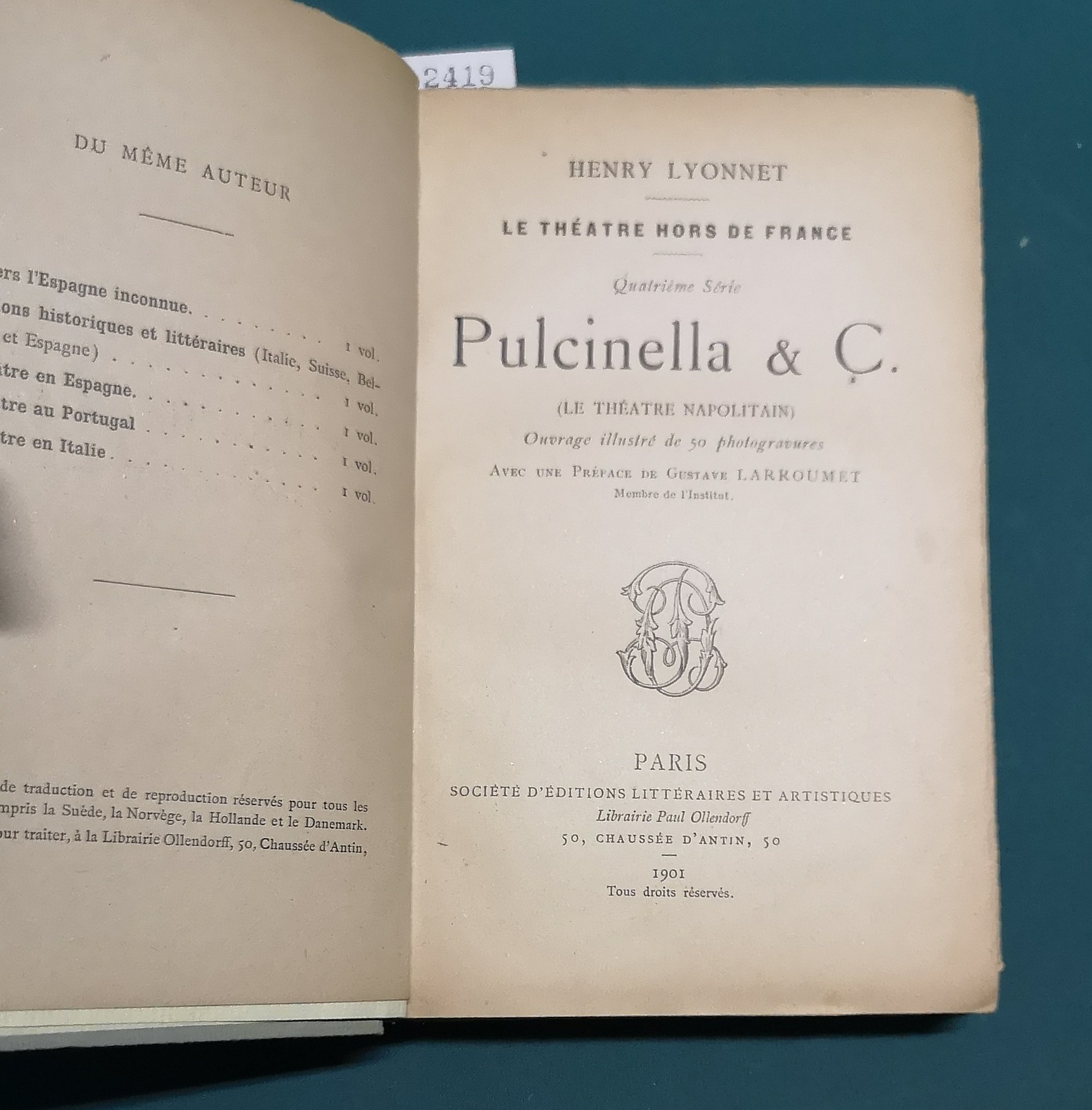>in-16, pp. (4), XIII, (1), 367, (3); leg. in cartoncino, tassello in pelle al dorso con tit. oro. Importante monografia illustrata con 50 fotoincisioni, prefazione a cura di G. Larroumet. Lyonnet, dopo aver approfondito la situazione teatrale spagnola e portoghese continuò in Italia la sua inchiesta sul teatro ''hors de France''. Buon esempl.