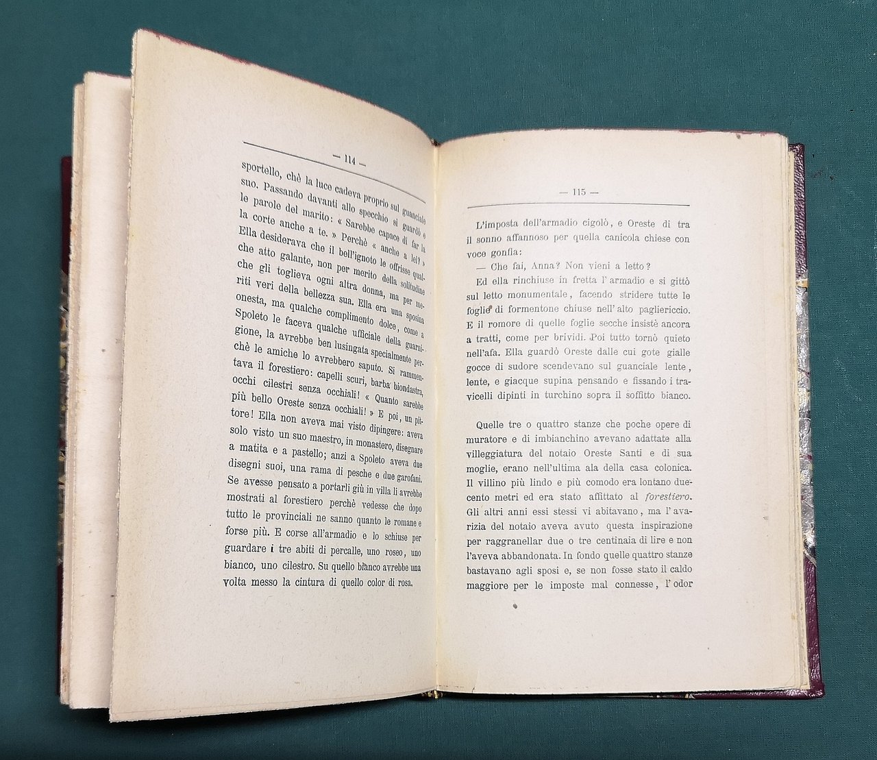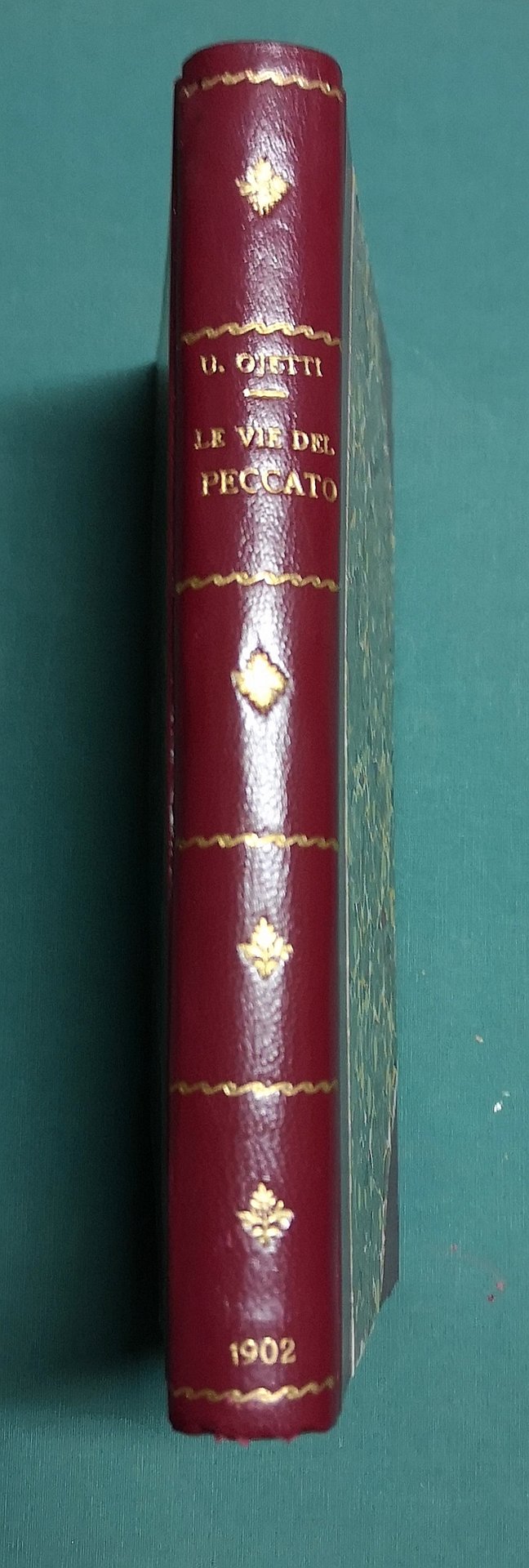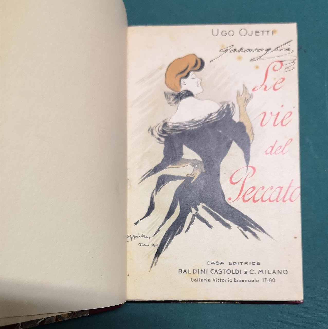 >in-16, pp. (8), 269, leg. d'amatore m. pelle, tit. oro, cop. edit. cons. (fig. femminile a colori firmata L. Cappiello). Ediz. originale. Raccolta di novelle in cui adultèri, seduzioni, tradimenti sono i “peccati” di cui si parla. In perfetto stato.