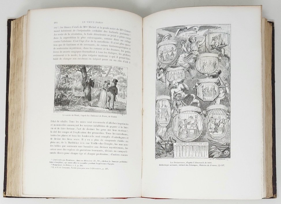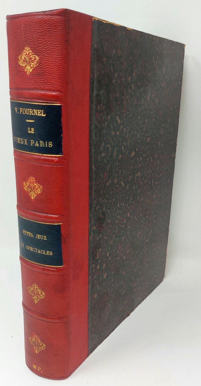 >in-8 gr., pp. 526, (2), legatura in m. marocchino rosso, dorso a nervi con duplice tassello in pelle bleu, titolo e fregi in oro. Approfondita monografia su ogni tipo di festa, gioco, spettacolo o passatempo nella città di Parigi dal Medioevo al XIX sec., corredata di numerose illustrazioni, anche a piena pagina. Ottimo esemplare.