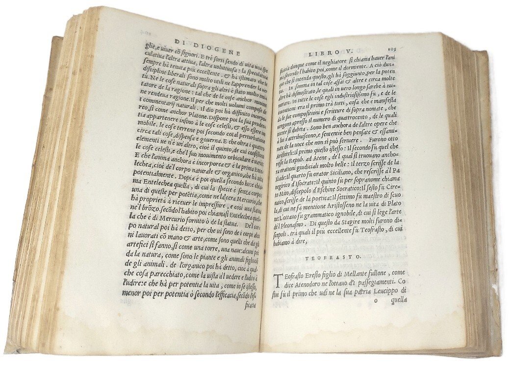 >in-8 (162x110 mm), ff. (8), 251, (1), legatura coeva in pergamena floscia (angolo del piatto anteriore con antico restauro), tracce di legacci. Impresa dello stampatore al titolo e al verso dell'ultimo f. Pregevole edizione del volgarizzamento delle ''Vite'' di Diogene Laerzio ad opera di B. e P. Rosettini (la prima ed. in italiano apparve nel 1480). L'opera in dieci libri fornisce preziose notizie per la conoscenza della biografia e del pensiero di un gran numero di filosofi antichi fino al II sec. Testo conosciutissimo nel Medioevo, ebbe enorme successo durante il Rinascimento. Esemplare genuino, con lievi aloni d'umido, più pronunciati nei primi fogli. Antiche note ms. cancellate al titolo, timbri di Gustavo Galletti e Bibliotheca Pagni. BMC 216. Adams D-492.