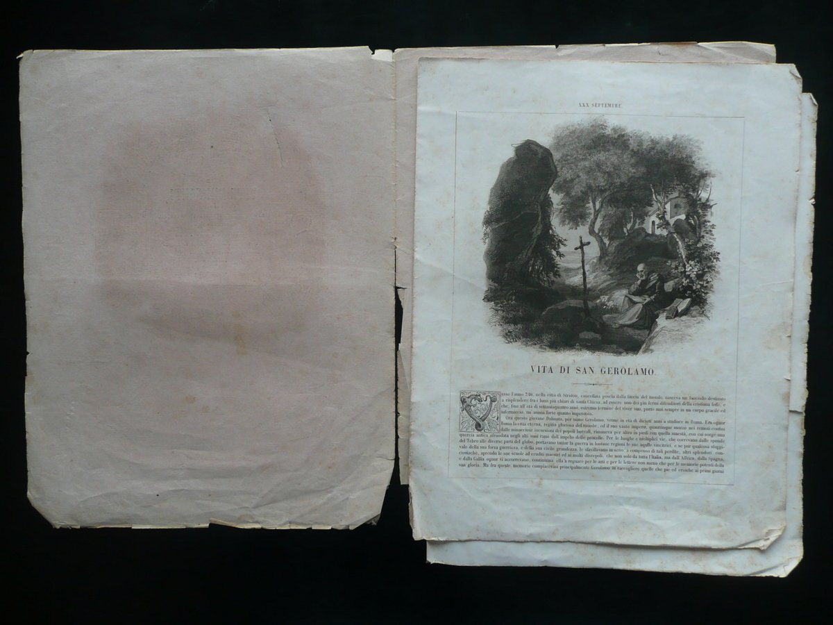 Le Vite dei Santi scritte or nuovamente da una Società di letterati cattolici, ecclesiastici e secolari, sotto la religiosa direzione d'una congrega dall'Ill.mo e Revmo. Sig. Afre Arcivescovo di Parigi a tal uopo scelta - San Gerolamo Saint - Hilaire Blanc & C., Lione / Parigi 1846, cm 30,5x23,5, pp. non num. (pp. 8) con alcune belle ill. incise in b/n n. t.; brossura ed. Condizioni di conservazione Esemplare in condizioni più che discrete con tracce d'uso, alcune piccole leggere bruniture, margini e angoli delle brossure e delle pagine con alcuni piccoli strappetti e qualche pieghetta; dorso con una piccola mancanza e uno strappo lungo circa la metà inf. (vedi foto). Interni sciolti per mancanza delle cuciture. Presenza di alcune belle illustrazioni incise in bianco e nero nel testo. SC03.D10119 N bis