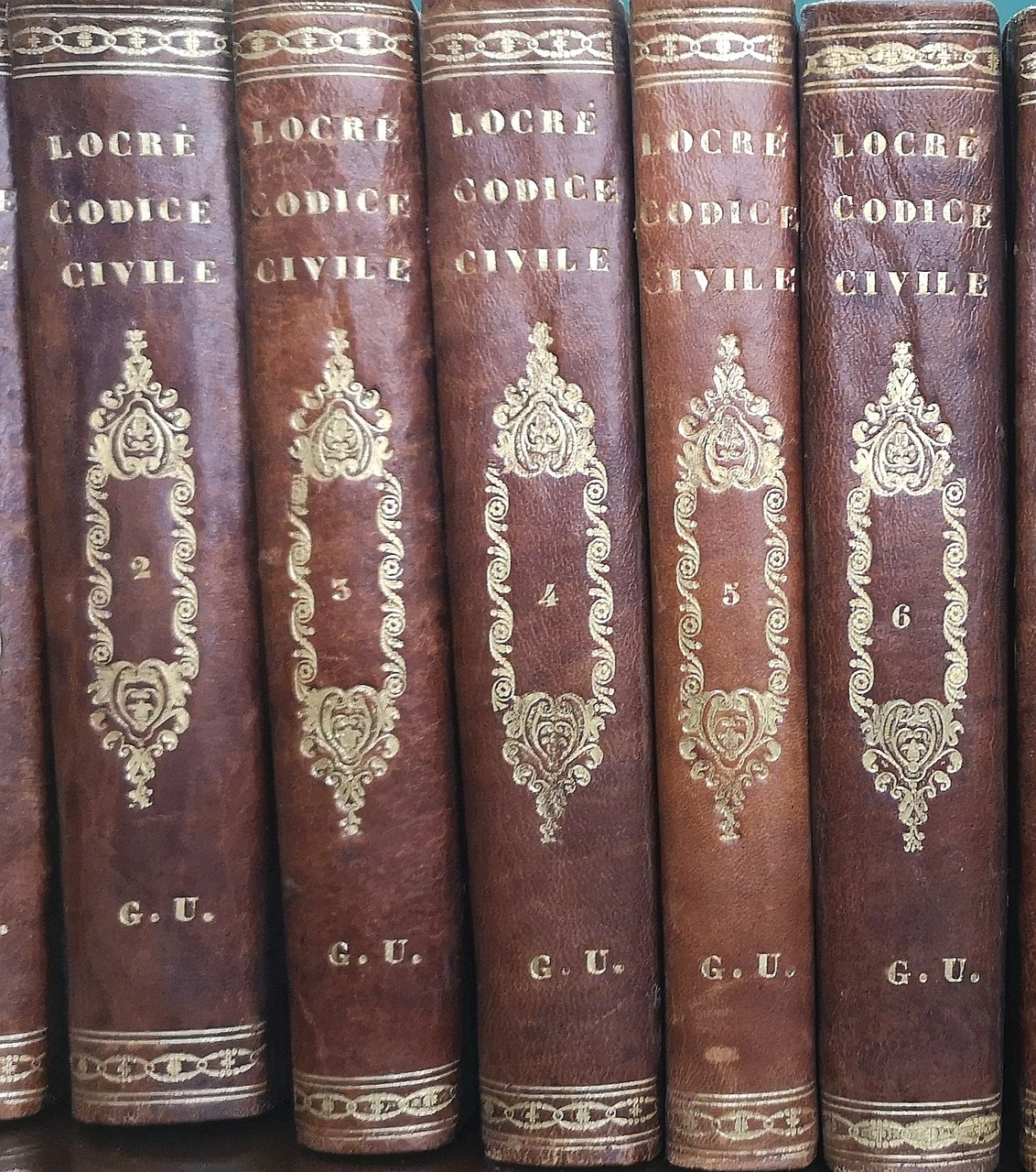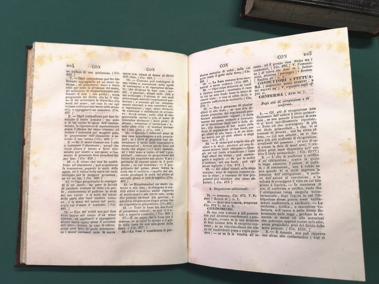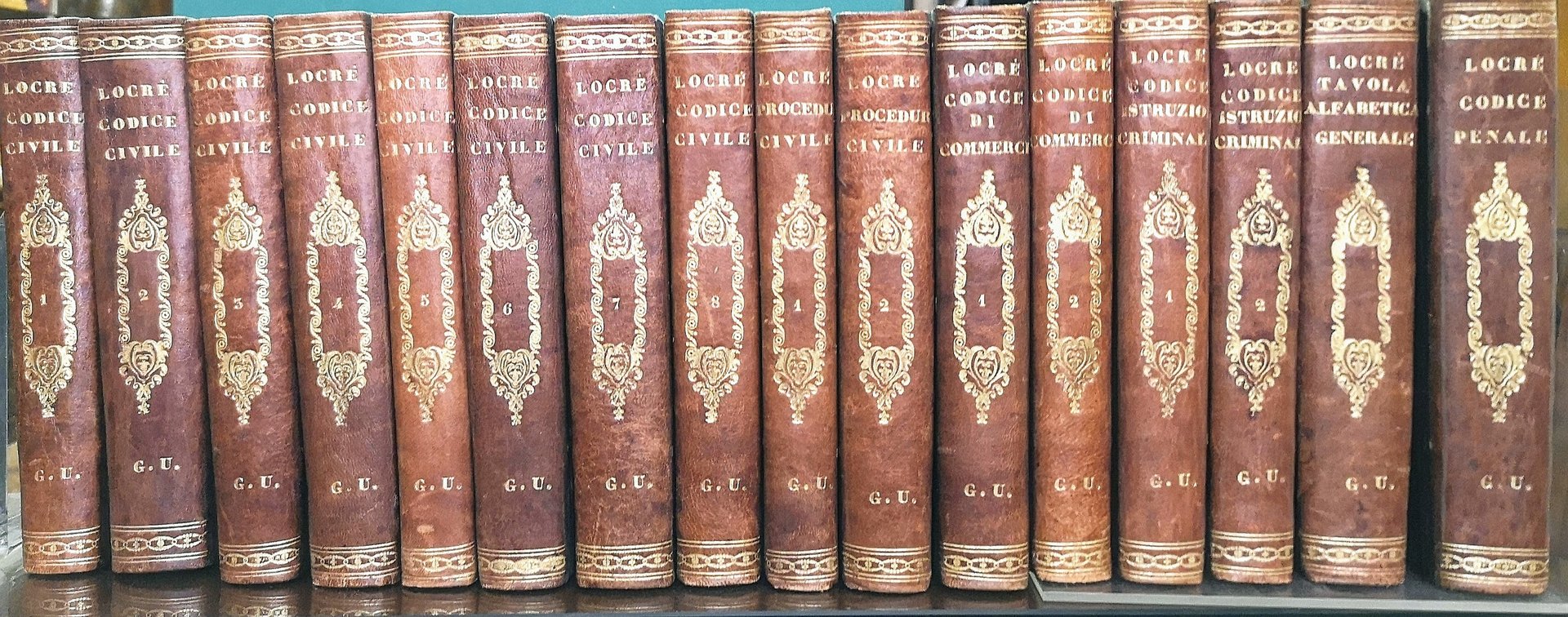 >16 volumi in-8, in bella legatura romantica p. pelle, cornice floreale a secco ai piatti, titoli e fregi in oro al dorso, tagli spruzzati. L'opera, completa, si compone di Voll. I-VIII - Codice civile: pp. 695, 847, 664, 752, 552, 663, 740, 638, (2); Voll. IX-X - Codice di procedura civile: pp. 543, 695; Voll. XI-XII - Codice di commercio: pp. 648, 536; Voll. XIII-XIV - Codice d'istruzione criminale: pp. 620 - 594 Vol. XV - Codice penale: pp. 812; Vol. XVI - Tavola alfabetica generale delle materie: pp. 823. Ottimo esemplare, fresco (minime e sporadiche arrossature della carta) in elegante legatura.