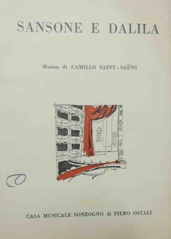 Sansone e Dalila. Opera in 3 atti, parole di Ferdinando Lemaire, musica di Camillo Saint-Saens, Casa Musicale Sonzogno di Piero Ostali, Milano 1957, pp. 39, cm 15, br. ed. Leggere tracce d’uso, qualche sgualcitura, un segnetto di biro alla prima di copertina, minima brunitura della carta, per il resto buona copia.