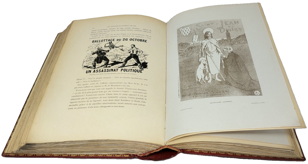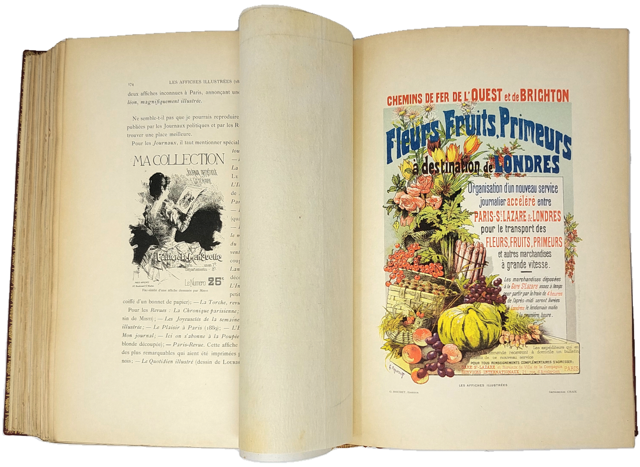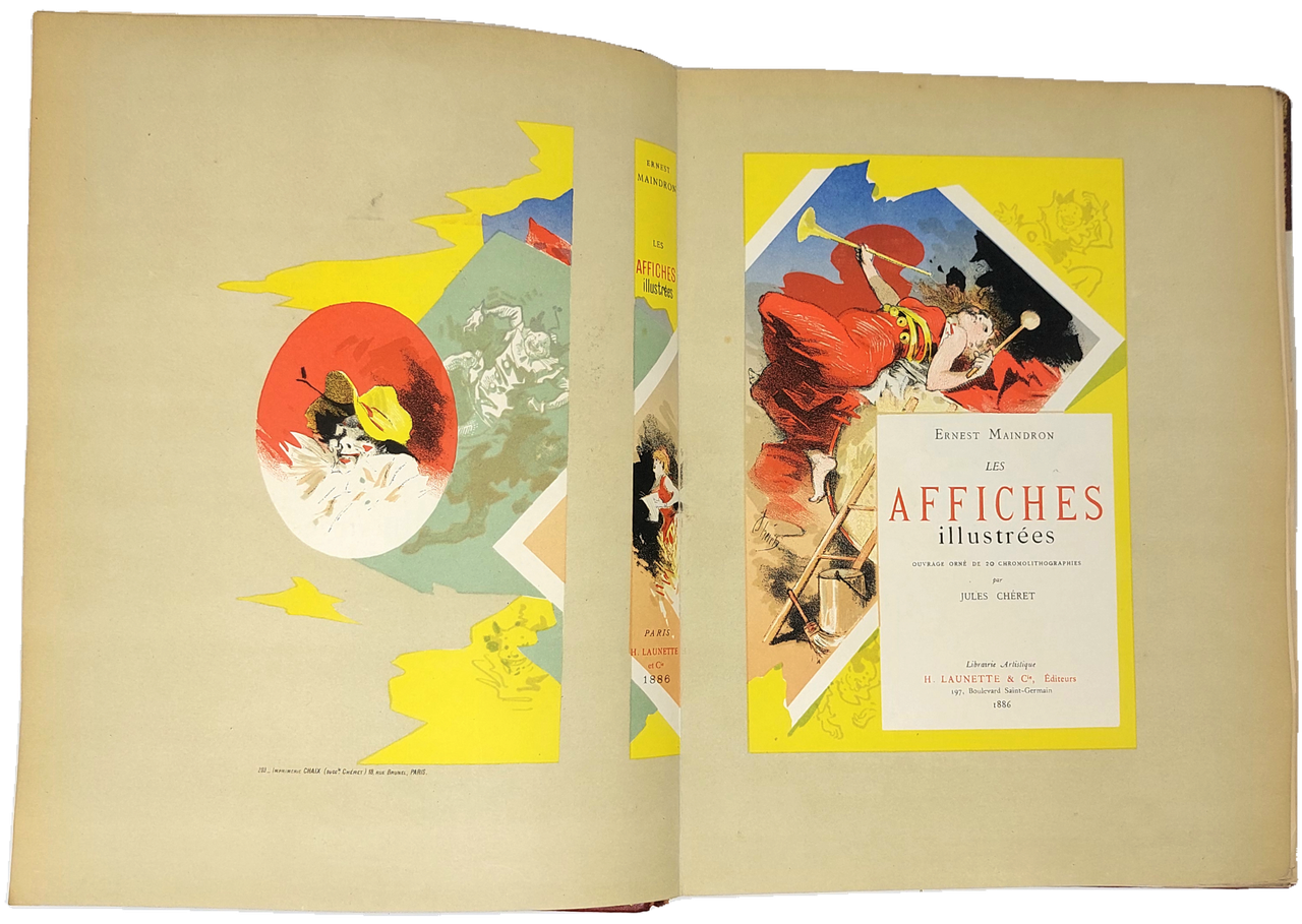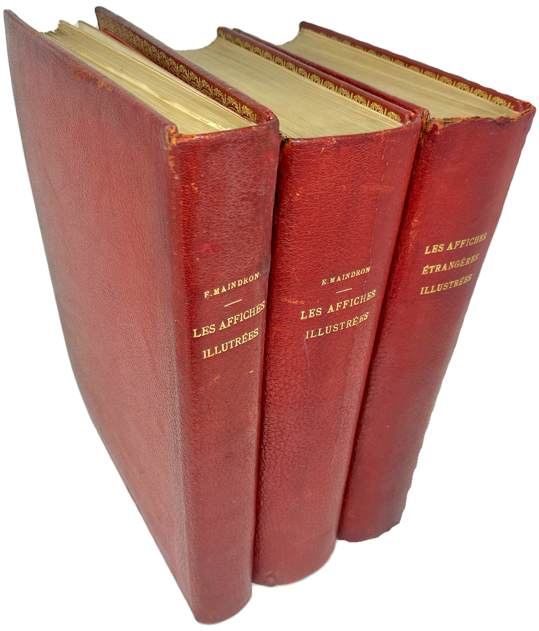 >3 volumi in-folio (325 x 244 mm), legatura coeva in pieno marocchino rosso scuro con titolo oro al dorso, dentelles interne, sguardie in seta rossa, taglio superiore dorato ( piccoli restauri alle cuffie e alle cerniere). L'assieme è così suddiviso: “Les affiches illustrées ouvrage orné de 20 chromolithographies” (1886). pp. X, 160. Uno dei venticinque esemplari su grande carta giapponese contenente le copertine in doppio bistro e a colori, inoltre sono stati aggiunte tre tavole a colori "...on a joint trois planches en couleur reproductions de trois affiches refusées". “Les affiches illustrées (1886-1895) ouvrage orné de 64 lithographies en couleur et de cent reproductions en noir et en couleur. D'après les affiches originales des meilleurs artistes”: pp. (6), II, 251, (5); III. “Les Affiches Etrangères illustrées ouvrage orné de 62 lithographies en couleurs et de cent cinquante reproductions en noir et en couleurs": pp.(6), III, 206, (8). Tutti e tre i volumi presentano brossure editoriali in doppio stato (monocromatica ed a colori). “Ernest Maindron was the great poster collector of the period. When he wrote Les Affiches Illustrées, a history of the poster based on the 10,000 examples in his possession, he had the happy idea of asking Cheret to use reductions by the Imprimerie Chaix of twenty of his best-known designs as colored illustrations… Ten years later Maindron published his far more significant sequel, Les Affiches Illustrées (1886-1895), which surveys the subsequent history of the poster, this time with seventy-two color plates by the Imprimerie Chaix, the majority after Cheret” (cfr. Ray, p. 468). Bellissimo ensemble ben conservato ed in elegante legatura uniforme, esemplare offerto dall'editore G. Boudet a Edmond De Goncourt. Dedica manoscritta in antiporta al primo volume: "«Un des vingt-cinq exemplaires sur grand papier du japon contenant les couvertures en double état bistre et couleur et auquel on a joint trois planches en couleur reproductions de trois affiches refusées. Edmond De Goncourt ». Gli altri due volumi presentano la dicitura: "Exemplaire offert à Monsieur... Hommage de cordiale amitié G Boudet", il nome dello scrittore De Goncourt risulta qui difficilmente leggibile in quanto in parte abraso. Monumentale raccolta di arte pubblicitaria, comprende manifesti illustrati da Cheret e dai maggiori illustratori dell'epoca: Toulouse-Lautrec, Frapoint, Gerbault, Grasset, Guillaume, Steinlen, Willetten. In buono stato di conservazione (qualche lieve fioritura). Ray, Gordon. The Art of the French Illustrated Book, 1700-1914. Carteret IV, 260. Monod 7640-7642.