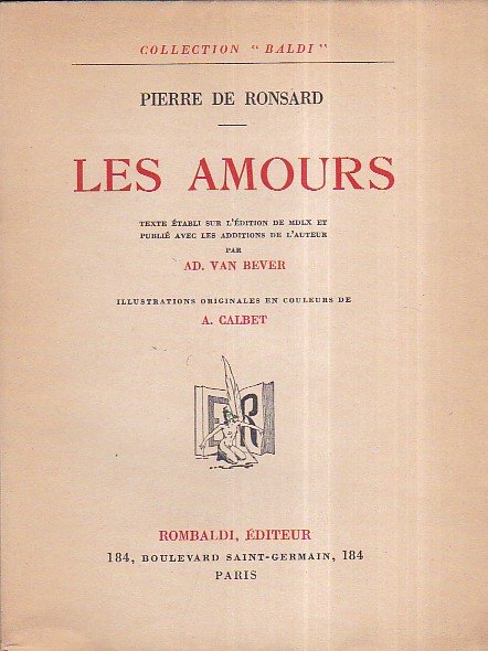 In-8°, pp. 252, (4), brossura editoriale incamiciata con titolo in rosso e nero. 5 tavole a colori f.t. di Antoine Calbet, di cui una all'antiporta. Ottimo esemplare entro velina. Esemplare n° 1355 su 'vergé de Voiron' (tiratura complessiva non determinata). Negli 'Amori' Ronsard celebra, con accenti richiamanti quelli del Petrarca per Laura, l'amore per Cassandra Salviati e quello per Marie Dupin, derivando dal Marot la tecnica del sonetto e giungendo ad uno dei vertici della lirica del Rinascimento. Collection 'Baldi'.