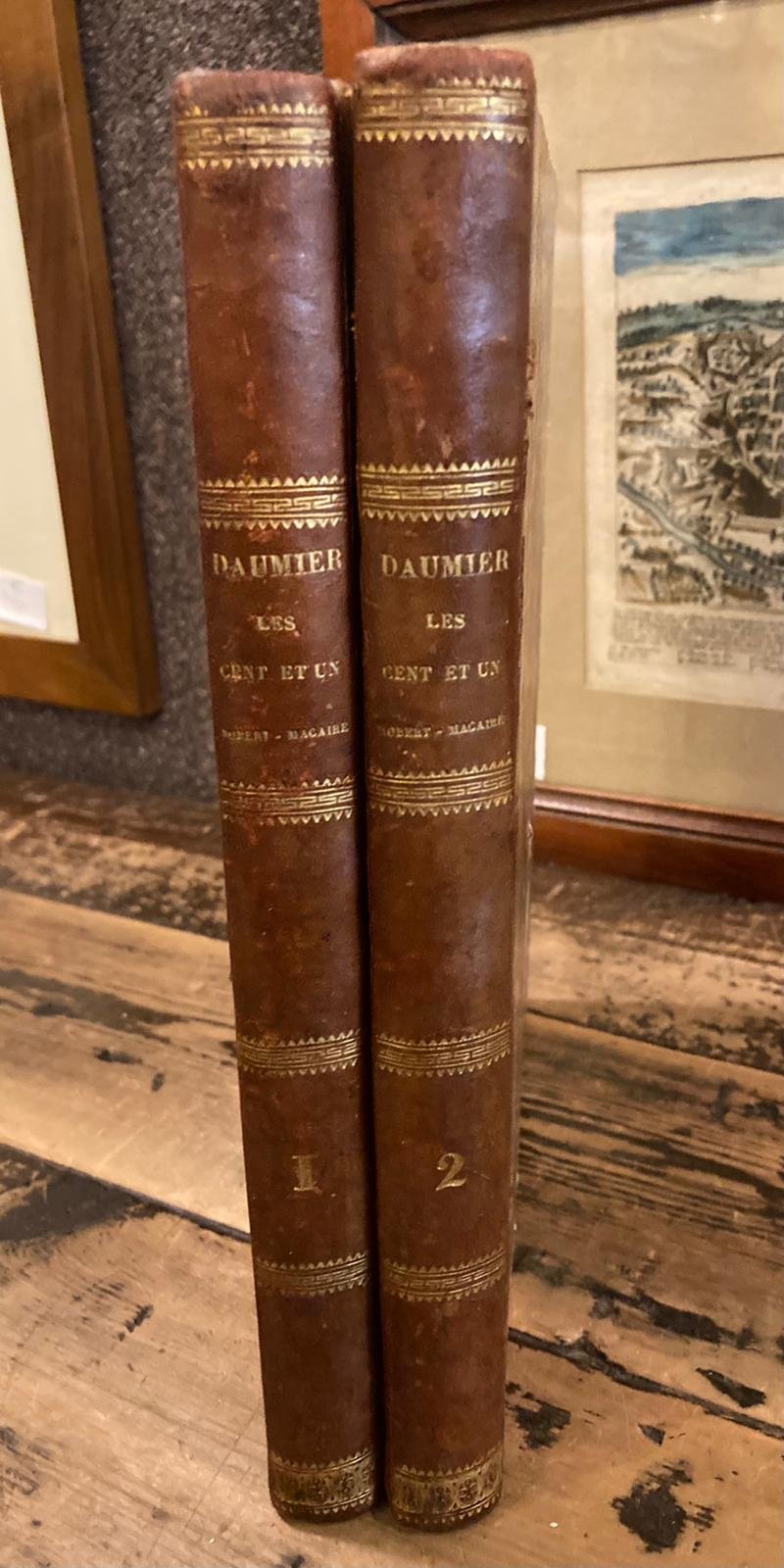 2 volumi in-4° (274x215mm), 212 cc. nn. con 101 litografie a piena pagina di Daumier, spiritose satire dei costumi della Francia del tempo attraverso l'immortale personaggio di Robert Macaire. Legatura coeva m. pelle marrone con titolo e decori in oro ai dorsi. Piatti marmorizzati. Ottimo stato. Reimpressione (l'edizione originale è dell'anno precedente) di una delle opere più rappresentative della caricatura e del disegno umoristico del XIX secolo, avente a protagonista il quasi proverbiale personaggio di Robert Macaire, prototipo dell'affarista senza scrupoli, secondo un modello che in quegli anni Balzac rendeva popolare nella letteratura nel suo immenso affresco della Francia del tempo. Cfr. Carteret, III, 187. Vicaire I, 31 e VI, 572.
