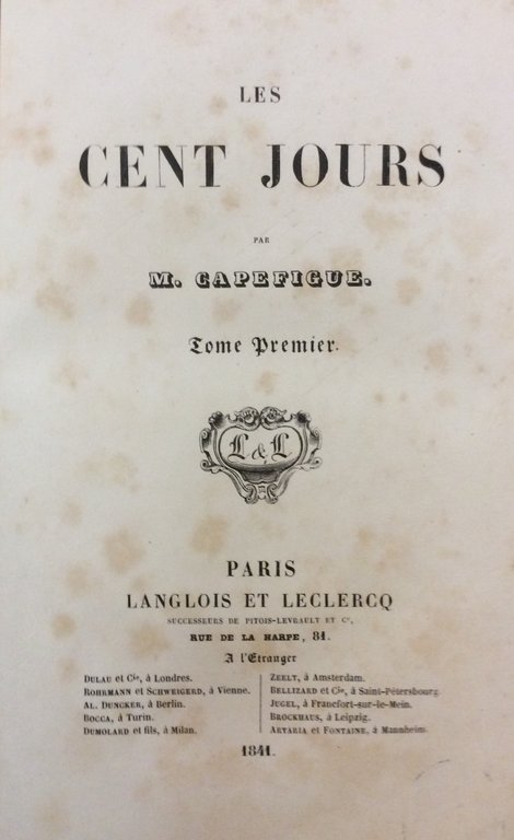 In-8 p. (mm. 230 x 137), 2 volumi, mz. pelle coeva con stemma e le iniziali S.M.F., fregi e titolo oro al dorso (piccola manc.), pp. (4),XI,409; (4),427. I cento giorni (marzo-giugno 1815) costituiscono il periodo compreso fra il rientro di Napoleone dall'Isola d'Elba e la seconda e definitiva restaurazione di Luigi XVIII sul trono di Francia. "Edizione originale". Cfr. Lorenz,I, p. 427. Timbri di apparten., qualche fiorit. e lievi arross. ma buon esemplare con barbe.