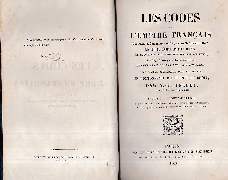 Les Codes de l' Empire Français contenant la Constitution du 14 janvier - 25 décembre 1852, les lois et décrets les plus récents, une nouvelle corrélation des articles des Codes, un Supplément par ordre alphabétique renfermant toutes les lois usuelles, une table générale des matières, un dictionnaire des termes du droit- 8e édition - Nouveau tirage. Renfermant dans le contexte même des articles les dénominations nouvelles, ainsi que toutes le dispositions aujourd' hui en vigueur | Libros antiguos y modernos | Teulet Auguste François (A Cura)