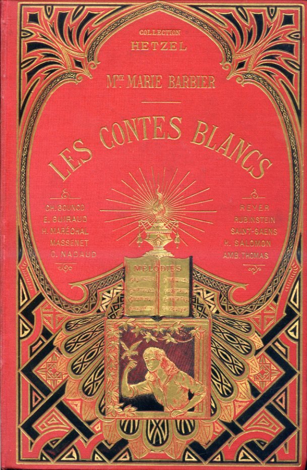 In-8°, pp. (8), 360, (8) di catalogo editoriale. Cartonnage hetzeliano in t. tela rossa con titolo in oro e ricca cornice in oro e in nero con motivi ornamentali e geometrici, una lampada su cui arde una fiamma, uno spartito squadernato ed una fanciulla che si affaccia da una finestra con un uccellino posato sulla mano. Titolo in oro, decori e filetti in oro e in nero al dorso, ricchi decori in nero al piatto posteriore. Tagli dorati. Illustrazioni in b.n. n.t. e f.t. (una in antiporta) di P. Destez, J. Jeoffroy, Georges Roux. Numerose pp. di spartiti musicali di compositori fra i più illustri della Francia e dell'Europa del tempo, tra cui Gounod, Massenet e Saint-Saens. Perfetto stato. Edizione originale. Elegante raccolta di racconti per la gioventù, alcuni dei quali a sfondo orientaleggiante.