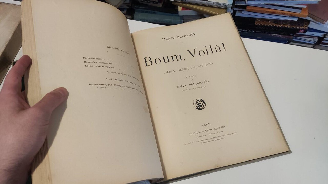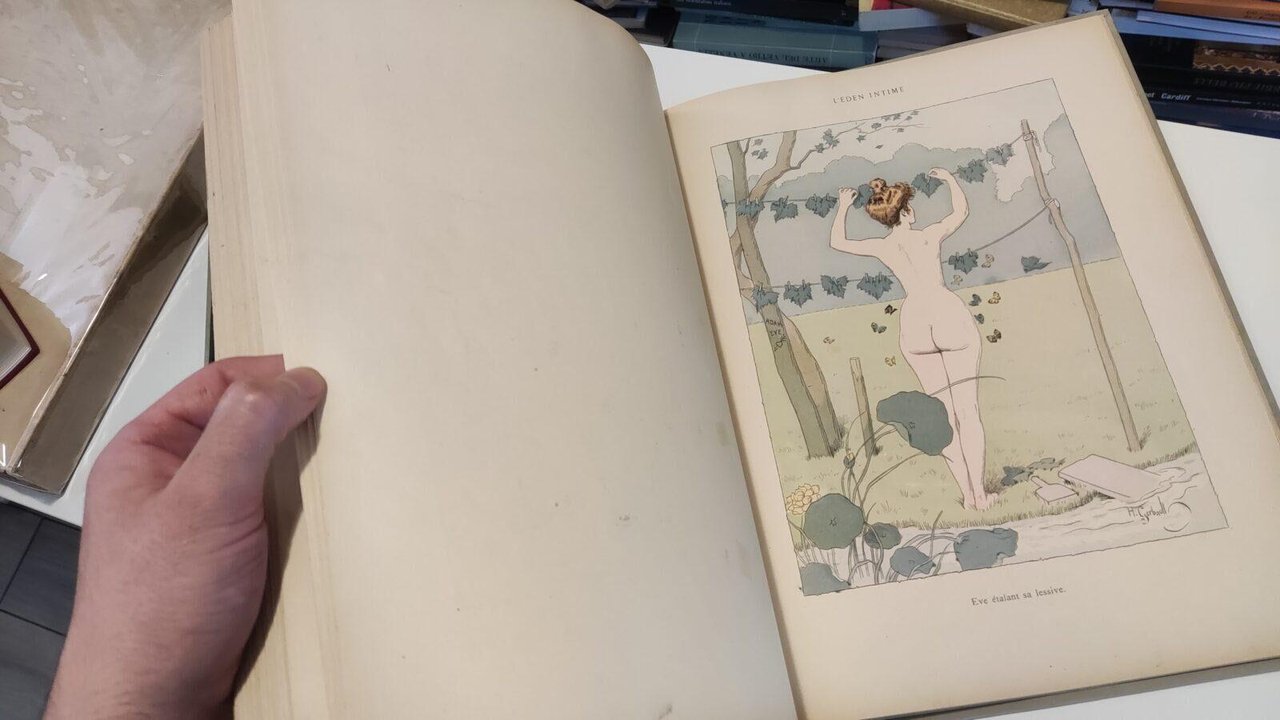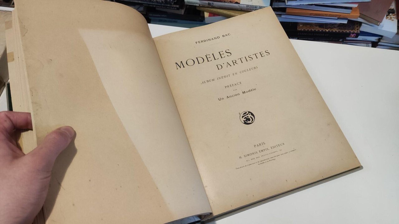 Prezioso volume rilegato comprendente 3 album illustrati Ferdinand Bac Les fetes galantes Album absolument inedit par Bac seguito da Modeles d'Artistes Album inedit en couleurs seguito da Henry Gerbault Boum, Voilà! Tutti e tre gli album sono editi da Empis - Paris intorno al 1900 La rilegatura in velluto grigio con tallone verde e titolo in oro sul piatto anteriore, velluto verde ai risguardi. Album oggetto di restauro nelle parti con difetti, qualche leggera fioritura sporadica. Libro in ottime condizioni, minimi segni del tempo: il secondo e il terzo album non hanno il frontespizio. Non esitate a contattarci per altre foto o richieste. Saremo lieti di soddisfare ogni vostra esigenza.