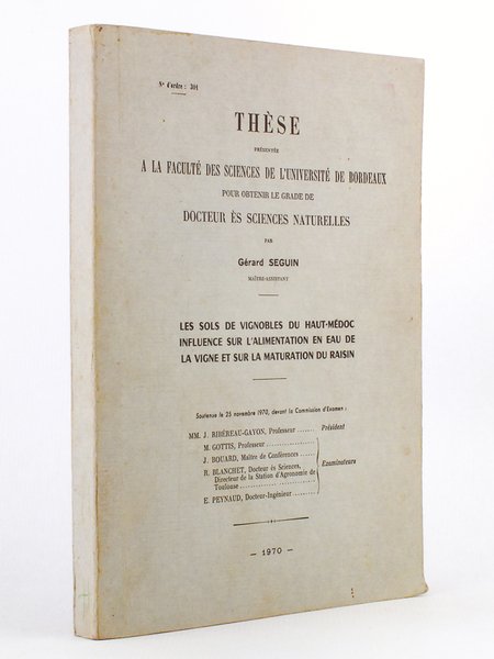 Rappel du titre complet : Les sols des vignobles du Haut-Médoc. Influence sur l'alimentation en eau de la vigne et sur la maturation du raisin. ( Thèse présentée à la Faculté des Sciences de l'Université de Bordeaux, pour obtenir le grade de Docteur ès Sciences Naturelles , soutenue le 25 novembre 1970 ) Bon état. L'auteur, Gérard Seguin, est devenu par la suite professeur d'oenologie à l'Université de Bordeaux. Nice copy of this doctoral thesis on vineyards soils in "Haut-Médoc"